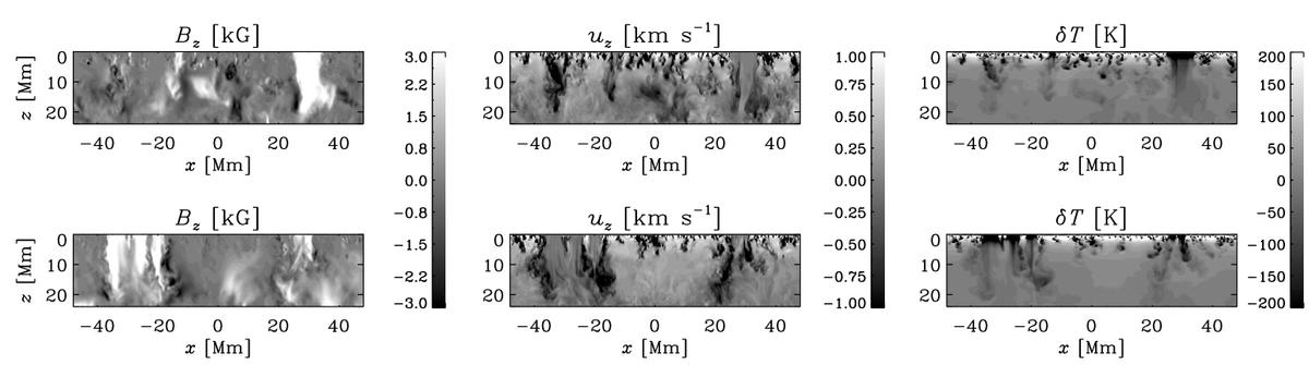 Top row: vertical magnetic field Bz, vertical velocity uz, and temperature T, respectively, at z = 0.6 Mm for Run C1v. The second and third rows show vertical cuts from cuts through y = 15.9 Mm and y = −5.8 Mm. In the rightmost panels we show the
