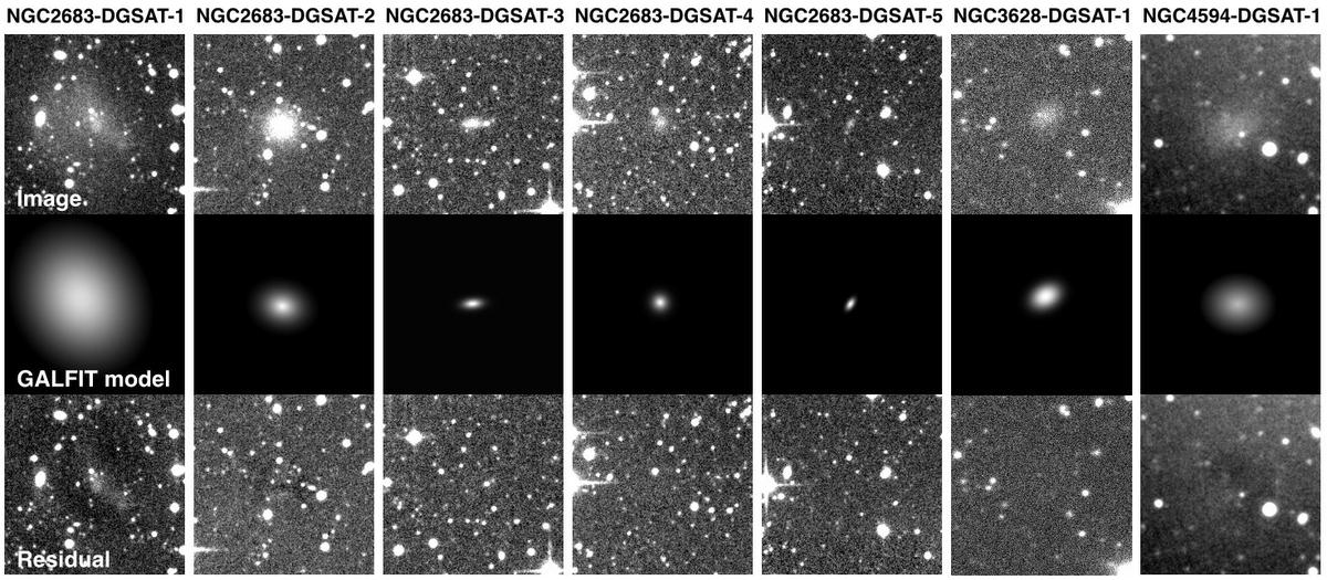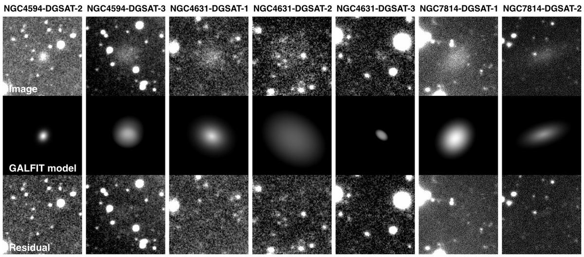 In both the top and bottom panels, the first row: dwarf galaxy candidates detected in our images (except that of the NGC 5457); the middle row: our GALFIT models (see Table 3 for the results of the modelling), and the bottom row: residual images obtained by subtracting the model image (middle) from the main image (top).