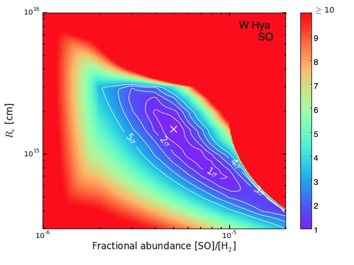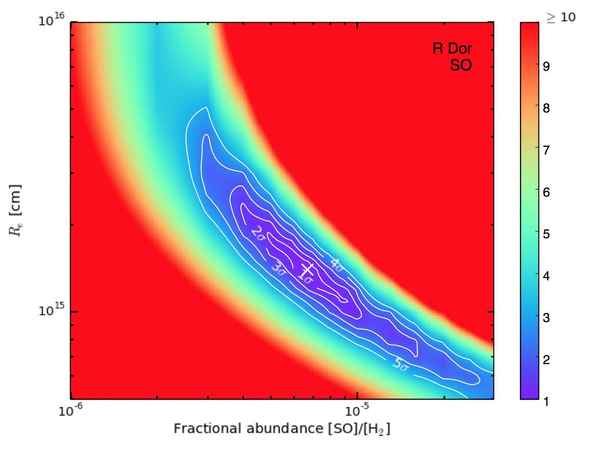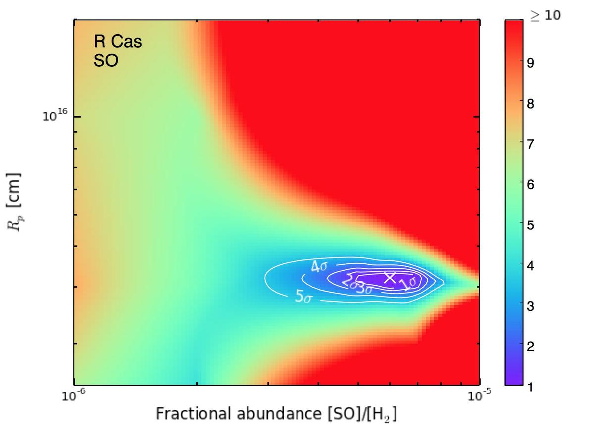 SO χ2 plots for R Dor, W Hya, IK Tau and R Cas. The contours show the confidence intervals and the shading represents the