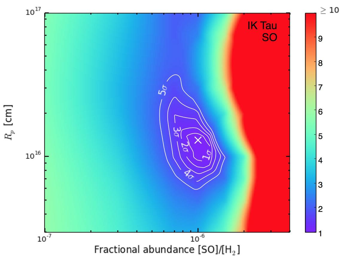 value. The white cross indicates our best-fit model (see Table 6). For IK Tau, the slice for which Rw = 1.8Rp is shown. For R Cas, the slice for which Rw = 1.0Rp is shown.