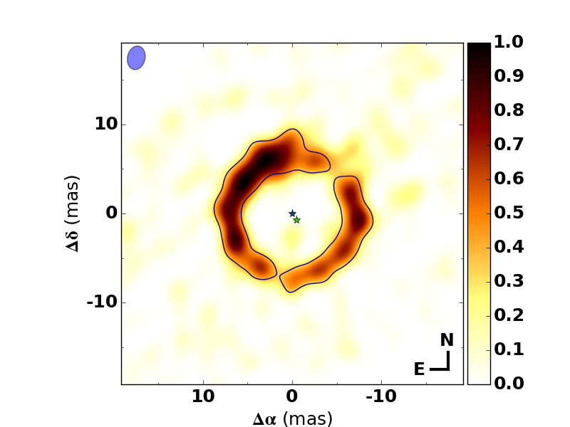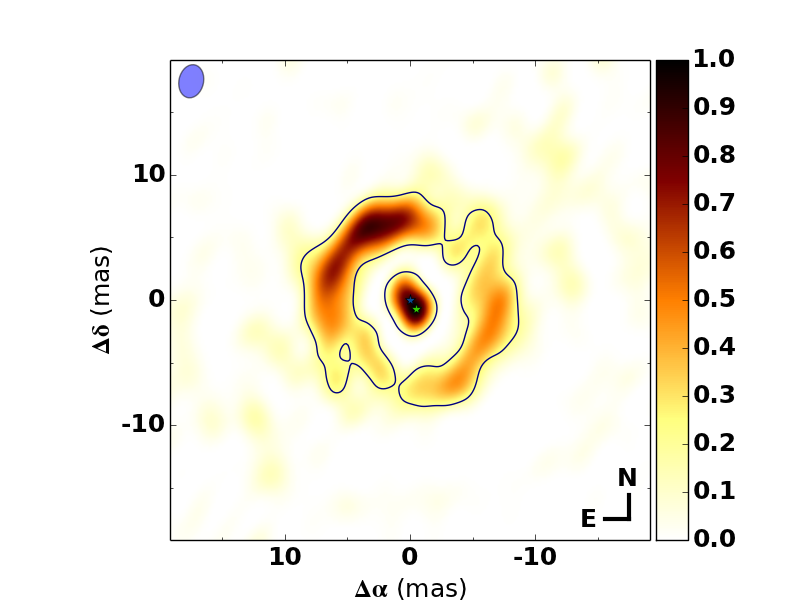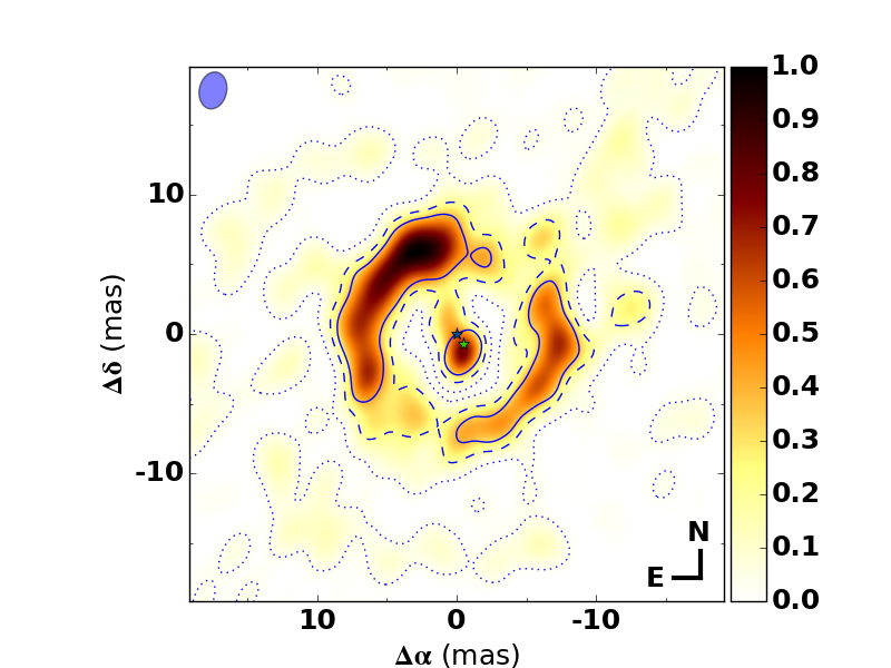 Reconstructed images. Upper panel: single-star-subtracted reconstruction of the original data. Middle panel: single-star-subtracted construction of the synthetic data set made with the best-fit parametric model. Lower panel: binary-subtracted reconstruction of the original data. The horizontal and vertical axes contain right ascension and declination coordinates in units of milli-arcseconds, respectively (the north and east directions are indicated in the lower right corner). The blue ellipse shows the beamsize. The full, dashed and dotted lines delineate pixels that have fluxes above 5, 3 and 1σ, respectively. For clarity only the 5σ contours are shown in the lower panels. The blue and green star symbols indicate the positions of the two stars as determined from the best-fit parametric model (the actual flux of the primary is subtracted from the image). The color indicates normalized flux, scaled to the highest pixel value in the image.