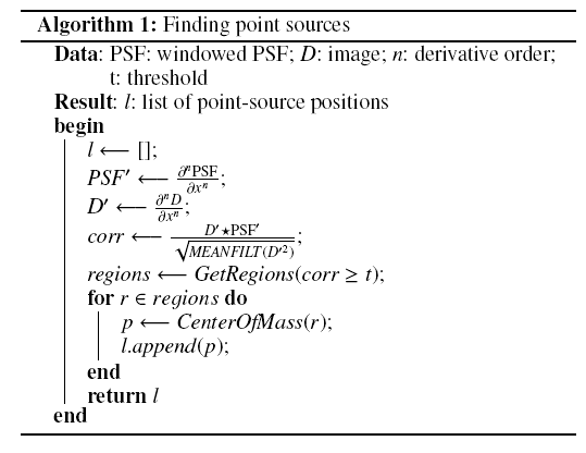 Evaluating the sharpness of an object can be achieved by measuring its nth derivatives and by comparing to the nth derivatives of the observed PSF. In practice, we took the Laplacian of the data and of the PSF and applied pattern matching using the fast normalized cross correlation proposed by Lewis (1995). This cross correlation is very efficient for a single-pass pattern matching, and the normalization it uses makes it independent of the source intensities. After the pattern matching, a simple thresholding operation gives the positions of the sources meeting the shape requirements. This process is summarized in Algorithm 1, where ⋆ is the cross-correlation operator and MEANFILT is a mean filter of the same size as the windowed PSF.