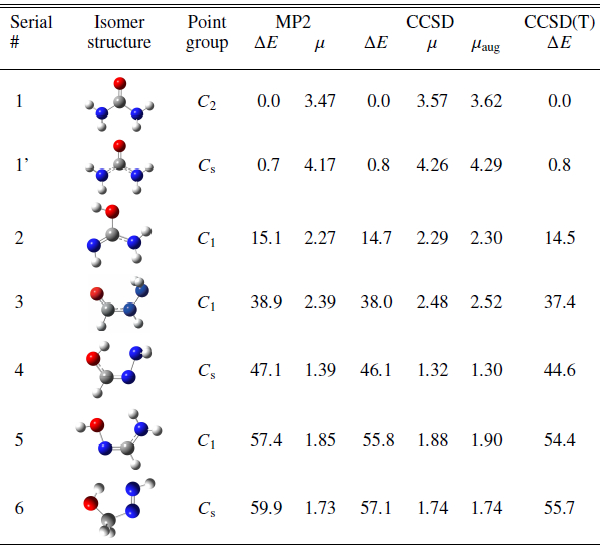 Computed relative stabilities ΔE (kcal/mol) and dipole moments μ (Debye) of the lowest six energy isomers of urea at post Hartree-Fock levels of theory.