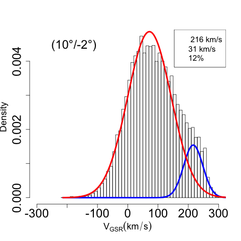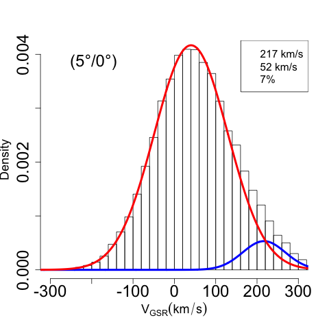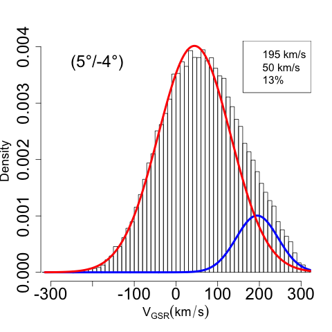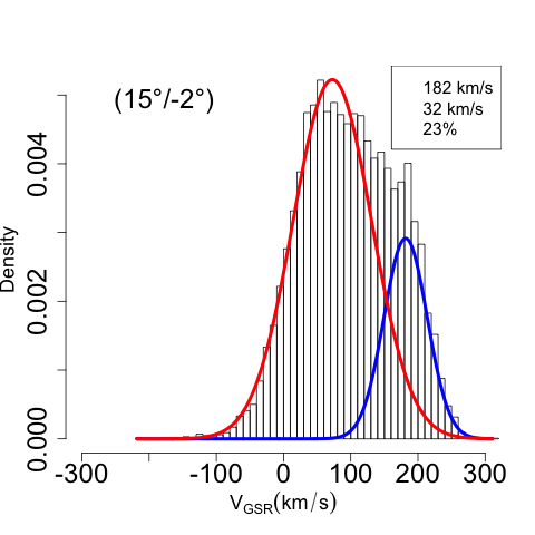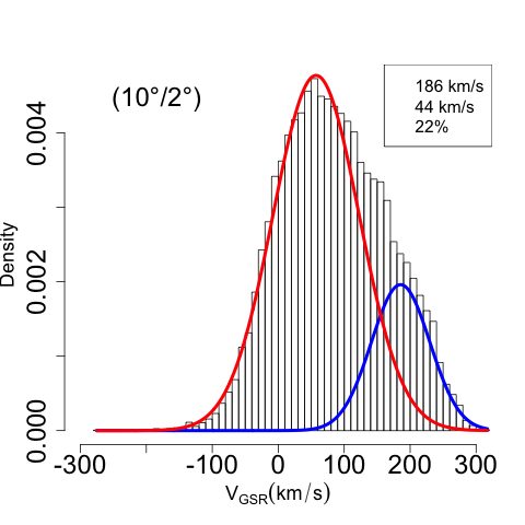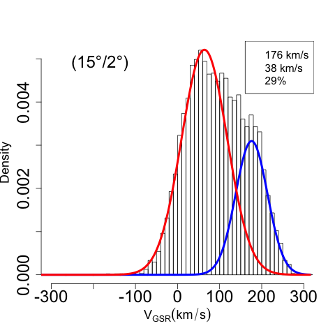 VGSR radial velocity histograms in different fields (l,b) (top left). The size of each field is Δl = Δb = 1° for l< 15° and 1.5° otherwise. All stars along each direction were selected. A two-Gaussian model is fitted to the data. The cold kinematic component is in blue and the corresponding mean value, dispersion, and fraction of stars (in percentage) are given at the top right. The mean errors are smaller than 1 km s-1 for the mean and the dispersion values and smaller than 1% for the fraction of stars.