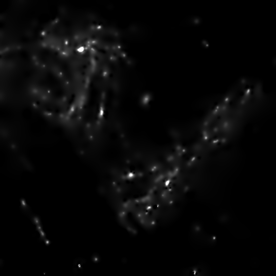 Application of MuSCADeT to the MACSJ1149+2223 cluster. Top left: colour image generated using the F475W, F606W, and F814W bands. Our goal is to separate the foreground cluster galaxies (red) from the background lensed galaxy (blue). Middle: the two sources extracted with 2000 iterations of MuSCADeT. Bottom left: original image minus the blue source found by MuSCADeT. Bottom right: same as the bottom left, with the red source subtracted. Top right: residual image obtained after subtraction of the two estimated sources from the original data.