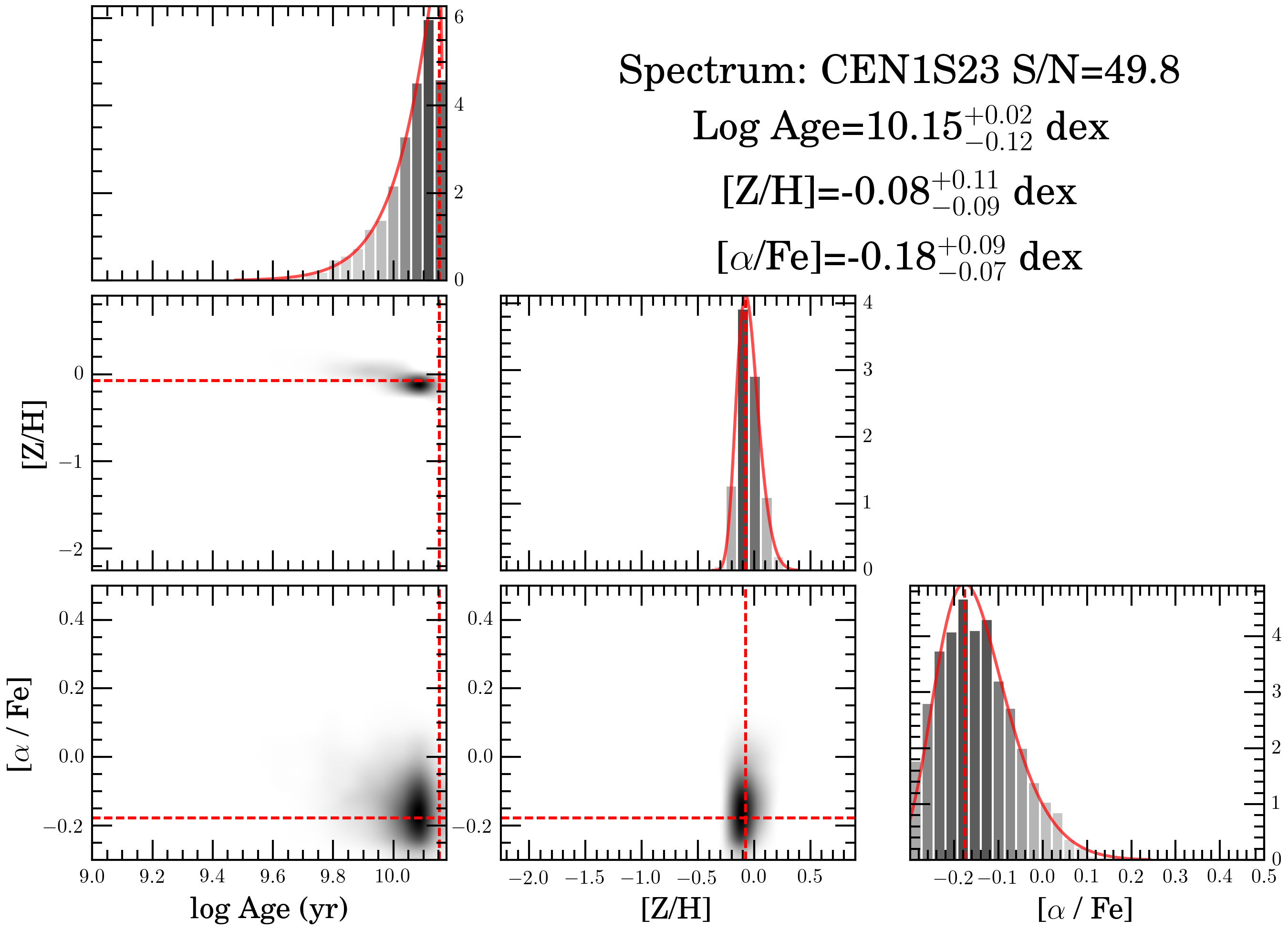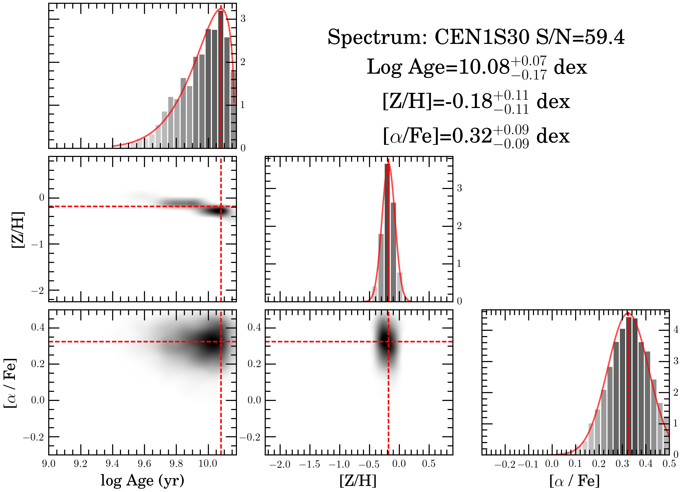Examples of the posterior distributions for two spectra using the MCMC method. The panels in the main diagonal show histograms of the marginalized distributions, which are used to determine the representative values and their uncertainties. The thick red lines show the best fit to the posterior samples, either a Gaussian or a generalized extreme value function. Projections of the posterior distributions in the lower left panels show the correlations among parameters. The histograms in the upper right corner of each panel indicate the maximum probabilities and the 1σ deviations of the stellar population parameters in each case.