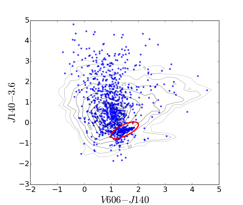 Colour−colour diagrams. Grey lines are number density contours for GOODS-South CANDELS objects, using Guo et al. (2013) photometry. Blue dots: A2744 cluster field, this work (only objects detected in all relevant bands are included). The large majority of the objects inside the red ellipses, which deviate from the typical distributions, are likely to be cluster members, as confirmed by the photo-z analysis in C16.