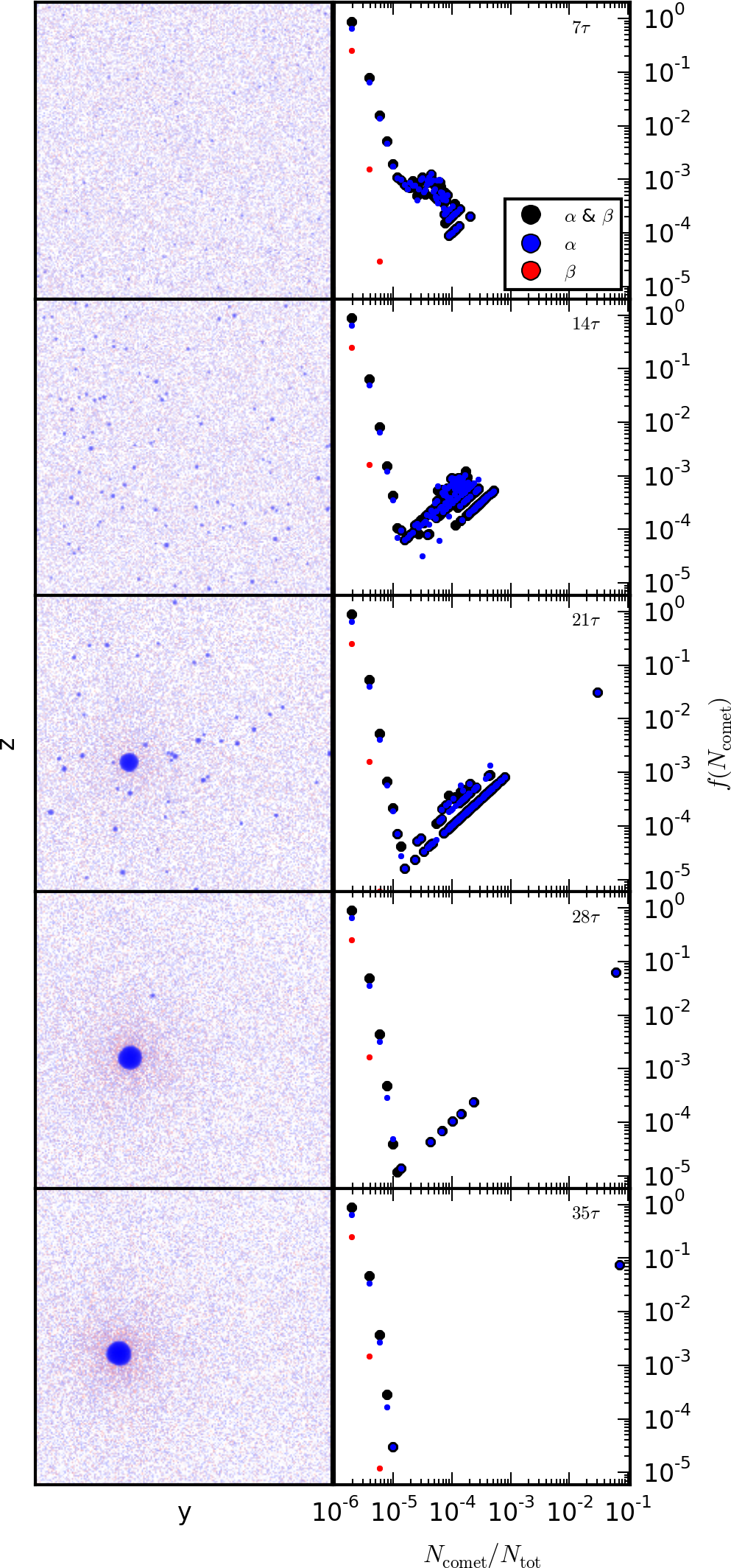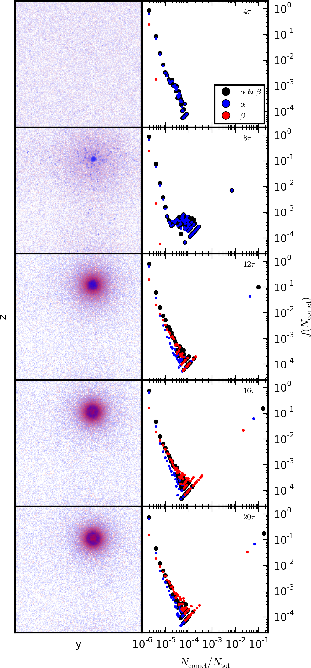 Time sequence of the simulation B75. On the left side, the slice shows in depth 20% of the super-molecules. On the right side, Ncomet is the number of super-molecules in one comet and