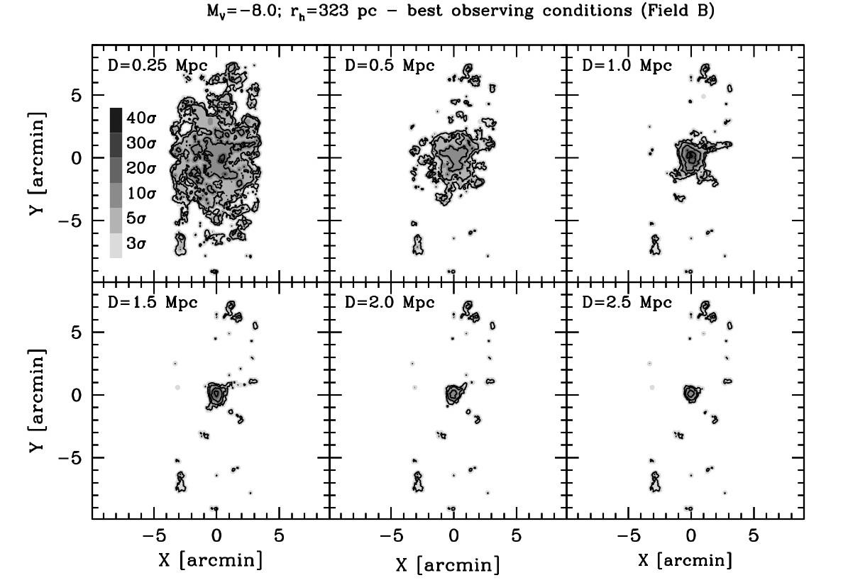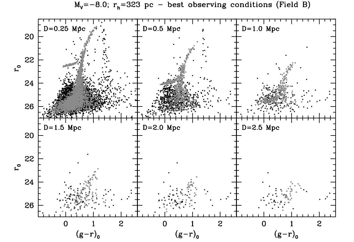 observed in SECCO (Best case). The galaxy is located at six different distances from D = 0.5 Mpc to D = 2.5 Mpc. The density scale is in terms of σ over the background (see Paper I). Lower panel: CMD of stars within 1 Rh of the centre of the synthetic galaxies shown above. Stars from the synthetic population are plotted in grey while field stars are plotted in black.