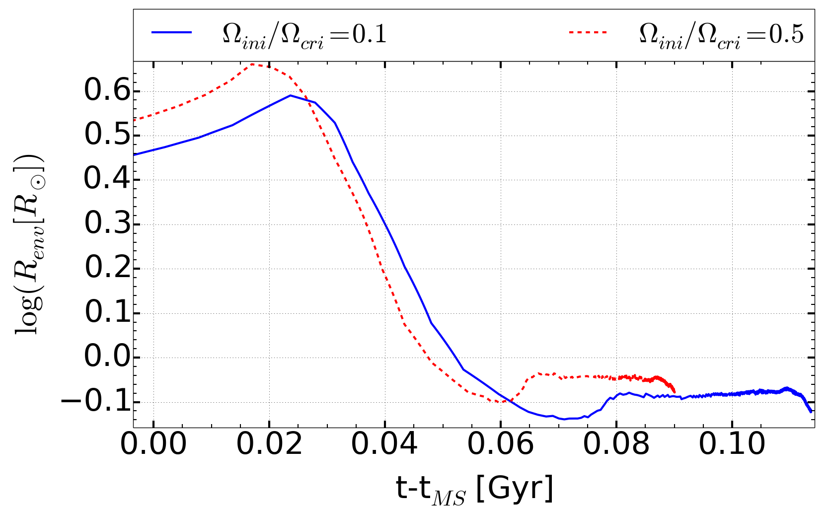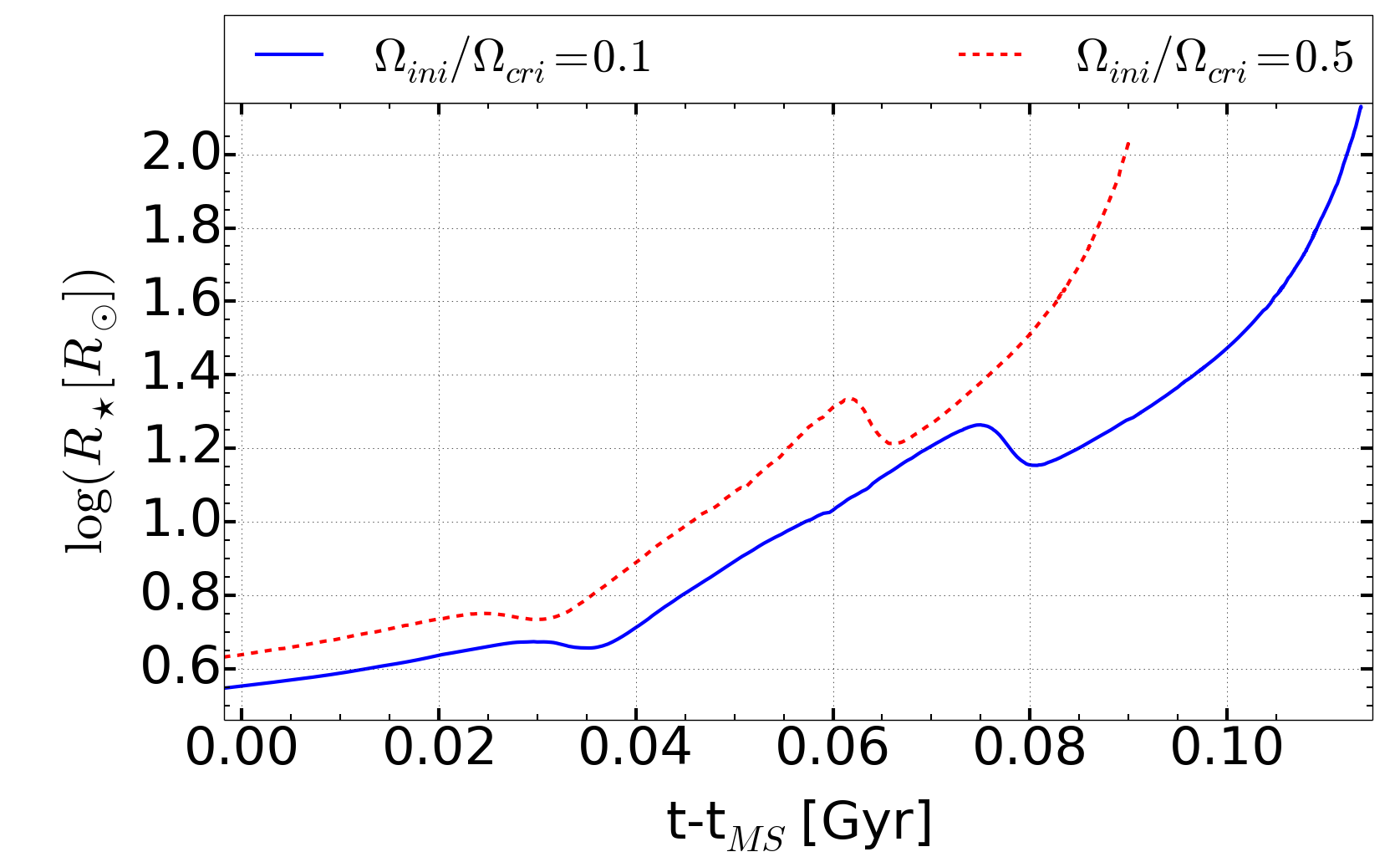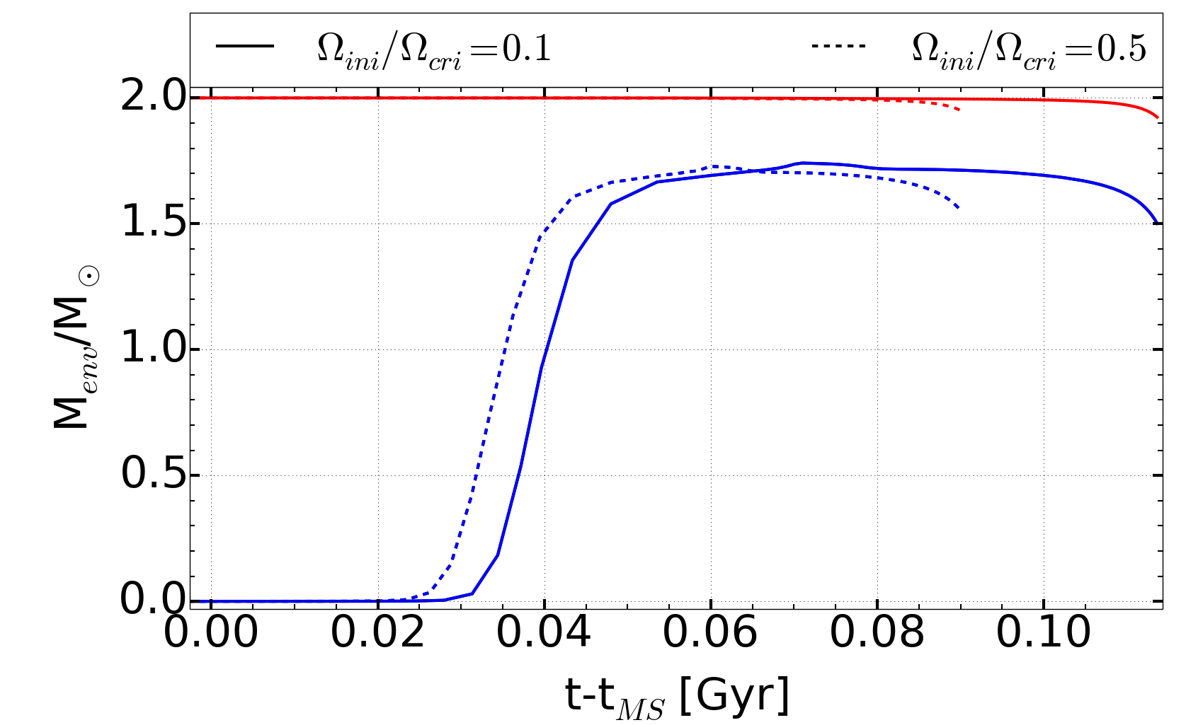 Top: evolution of stellar radii for the 2 M⊙ models. Continuous and dotted lines correspond to stars with initial velocities Ωini/ Ωcrit = 0.1 and 0.5, respectively. Time 0 corresponds to the end of the MS phase. Centre: evolution of the total mass of the star (upper red lines) and of the masses of the convective envelopes (lower blue curves) for the same stars as in the top panel. Bottom: radii at the bottom of the convective envelopes for the same stars as in the top panel.
