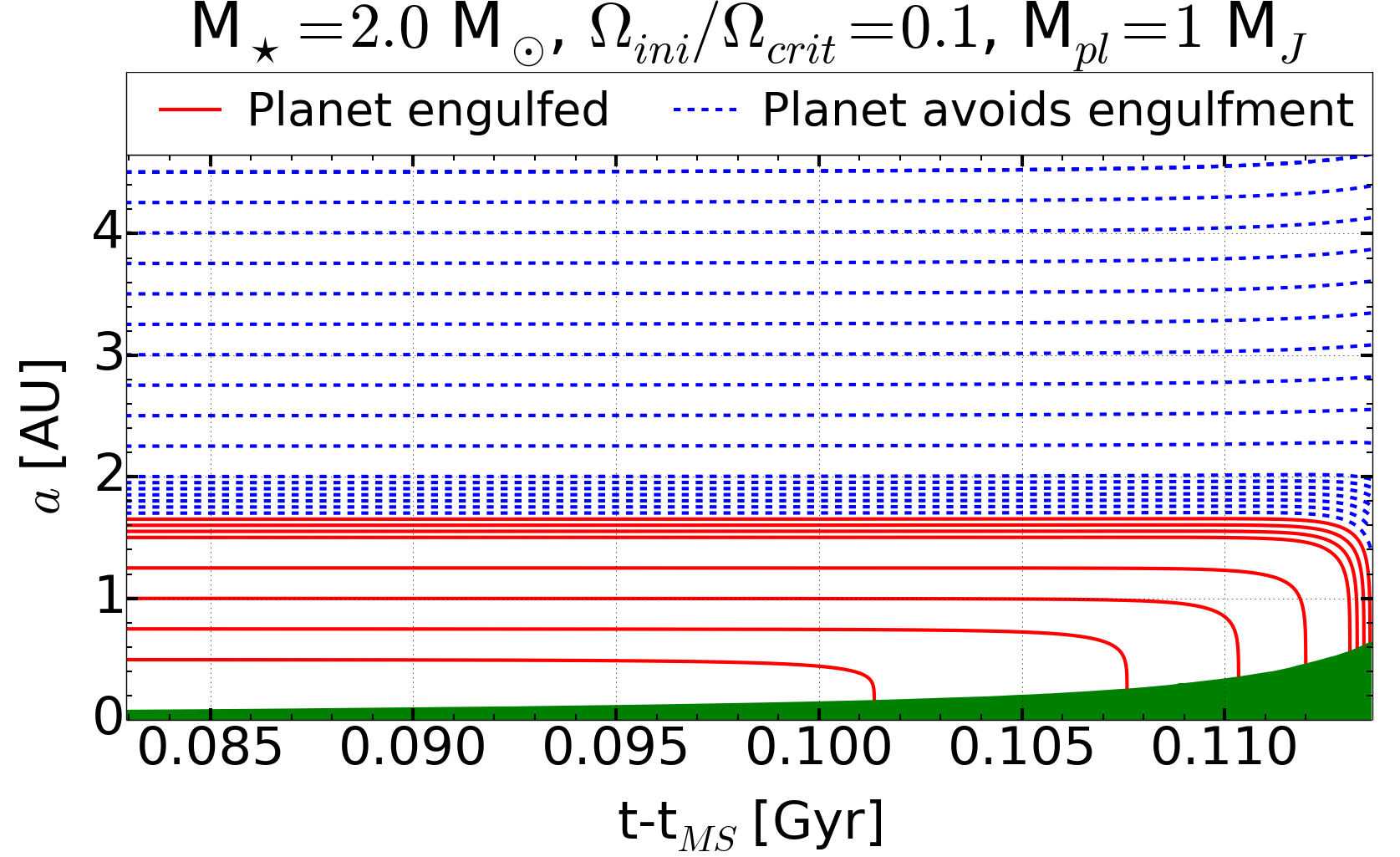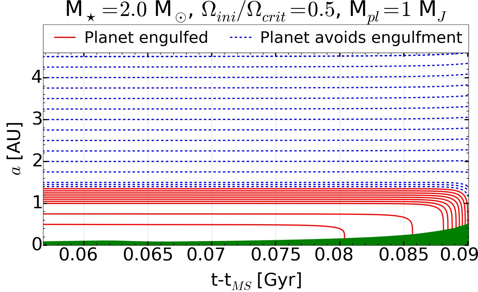 Left panel: evolution of the semi-major axis of a 1 MJ planet orbiting a 2 M⊙ star, computed with an initial rotation on the ZAMS of Ωini/ Ωcrit = 0.1. The different lines correspond to different initial semi-major axis values. Only the evolutions in the last 50−60 million years are shown. Before that time, the semi-major axis remains constant. The red solid lines represent the planets that will be engulfed before the star has reached the tip of the RG branch; the blue dashed lines represent the planet that will avoid the engulfment during the RG branch ascent. The upper envelope of the green area gives the value of the stellar radius. Right panel: same as the left panel, but for an initial rotation Ωini/ Ωcrit = 0.5.