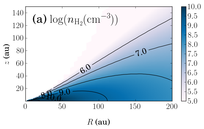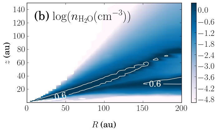 Overview of the adopted model structure. a) Logarithm of the molecular hydrogen density in cm-3 with black contours. b) Logarithm of the water vapor density with white contours at 0.6 cm-3. c) Gas temperature in K. Black contours represent the logarithm of the water abundance at 0.6 cm-3.