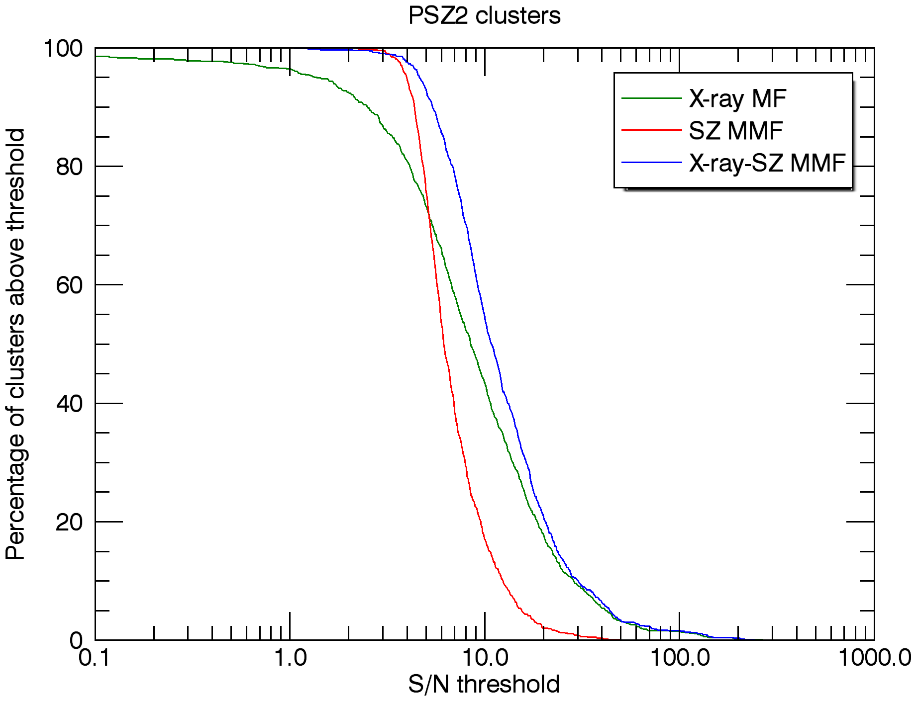 Percentage of MCXC (top panel) and PSZ2 (bottom panel) clusters extracted with the proposed X-ray matched filter (green), the classical SZ MMF (red), and the proposed X-ray-SZ MMF (blue) whose S/N is above a certain S/N threshold. In the top panel, the complete MCXC sample (solid lines) is divided into RASS (dotted lines) and serendipitous clusters (dashed lines).