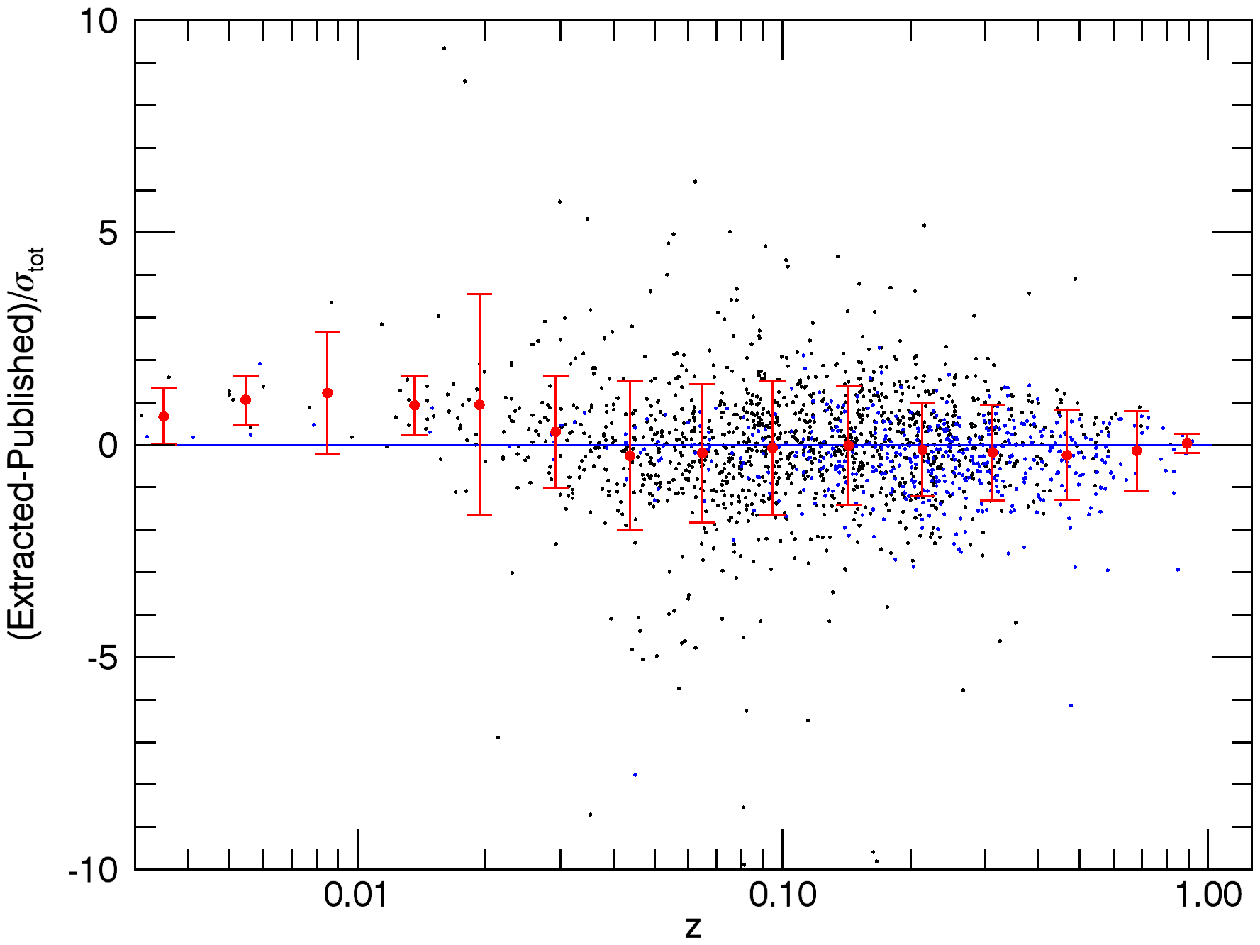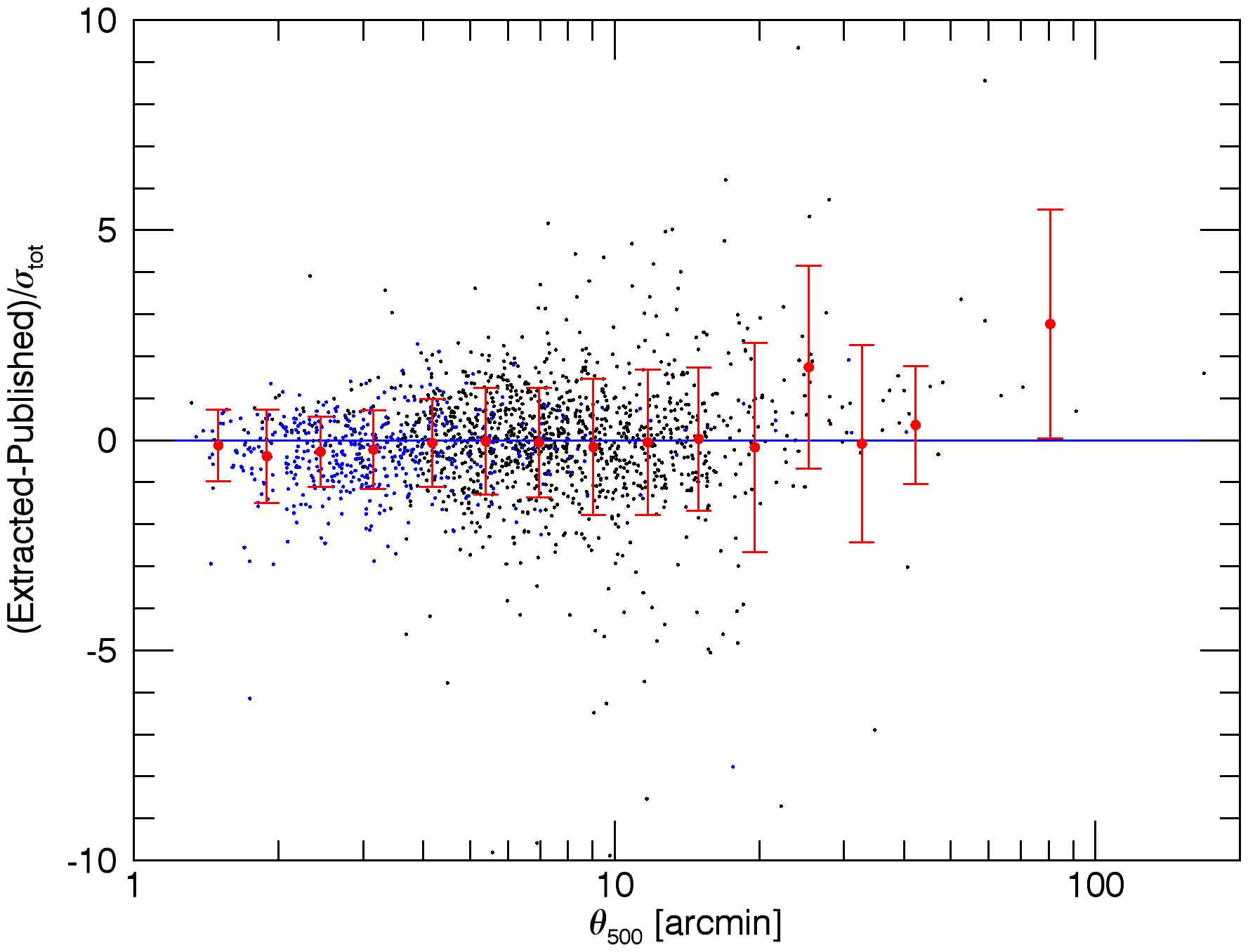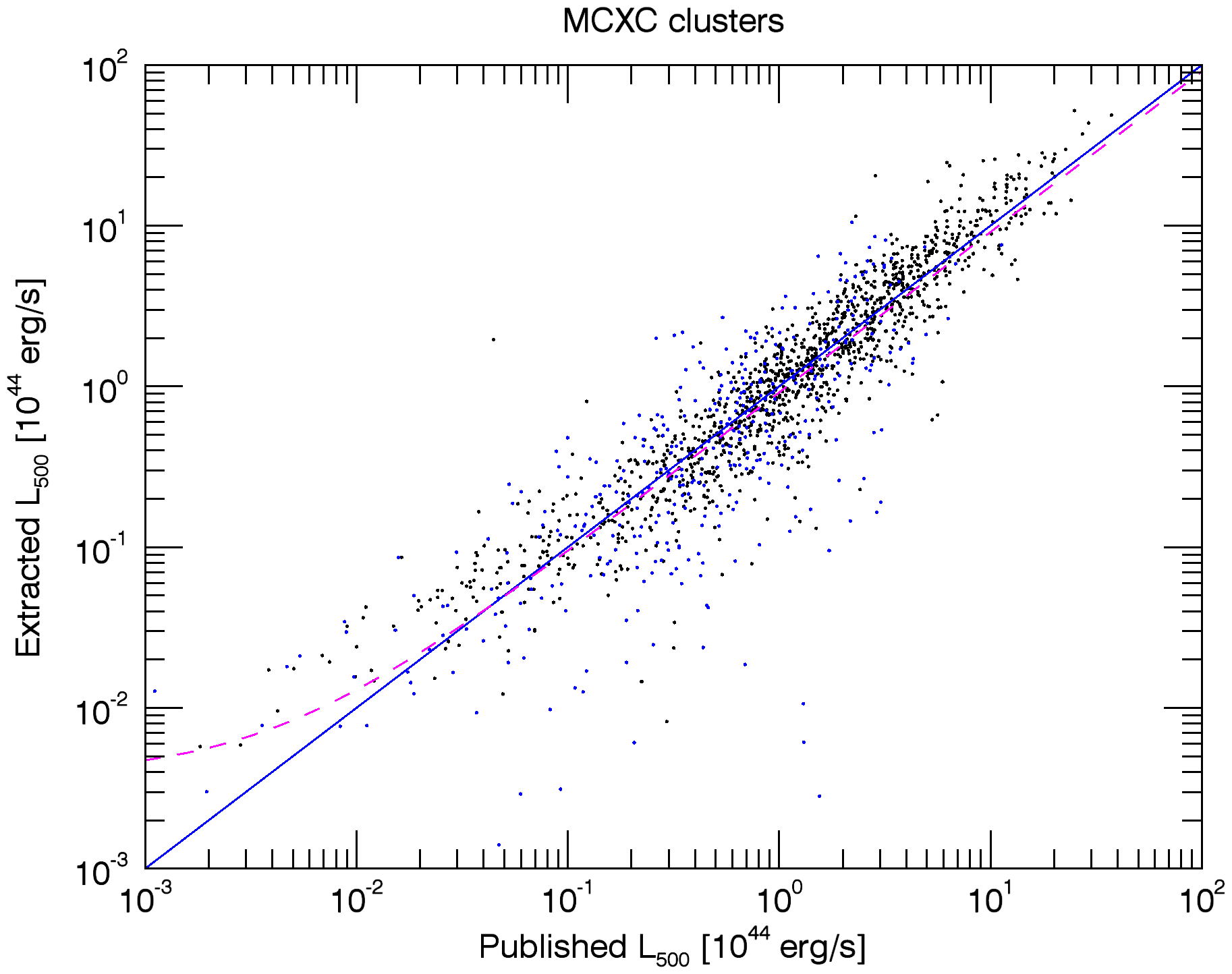 Photometry results of the extraction of the real MCXC clusters using the proposed X-ray matched filter and assuming the position and size of the clusters are known. The six panels are analogous to those in Fig. 1, but comparing the extracted L500 with the published L500. Individual measurements in panels a), c), d), e), and f) are shown as black and blue dots: the black dots correspond to clusters originally detected in RASS, the blue dots to serendipitous clusters. Panel b) shows three histograms that correspond to the RASS clusters (black), the serendipitous clusters (blue), and the complete MCXC sample (red).