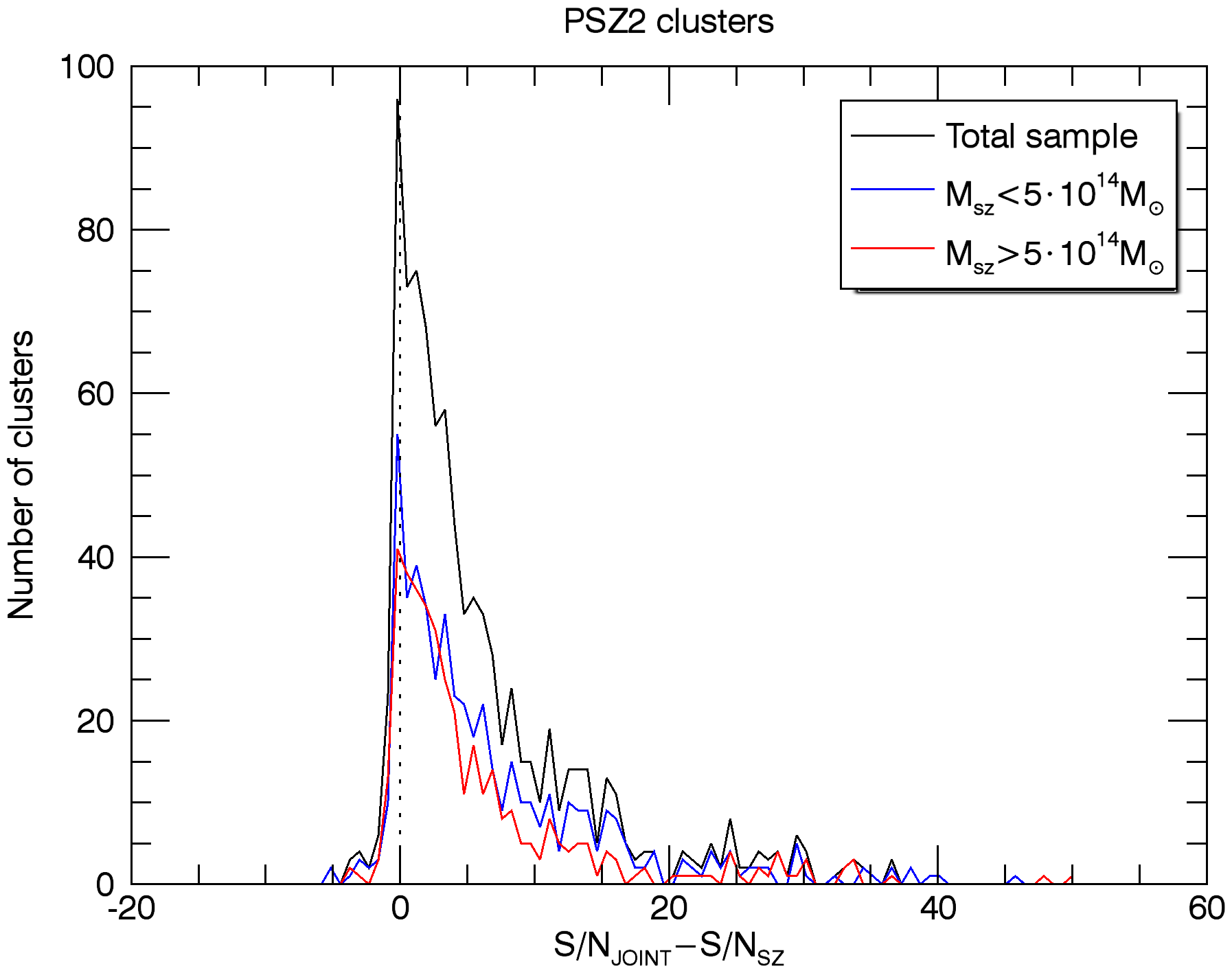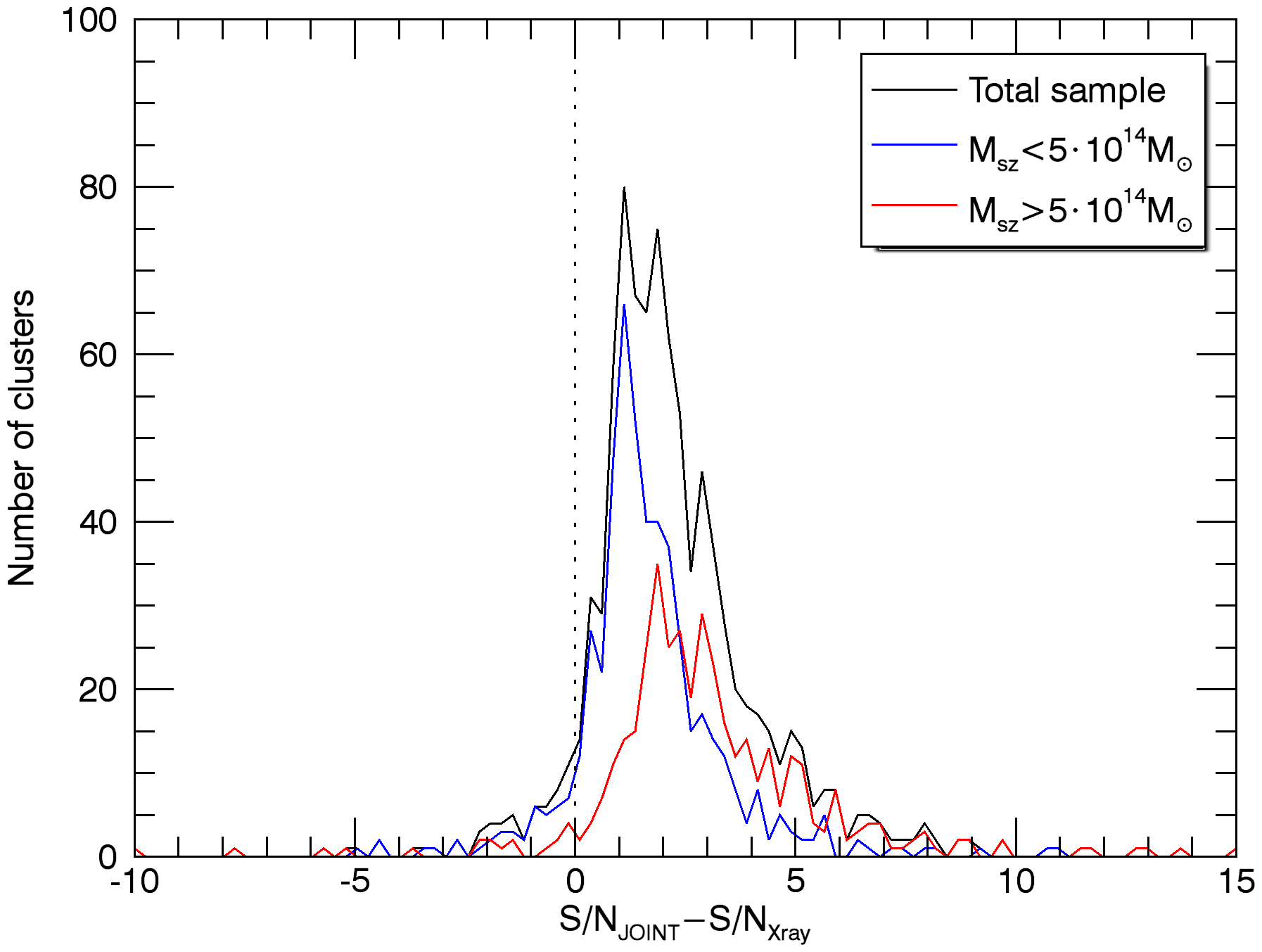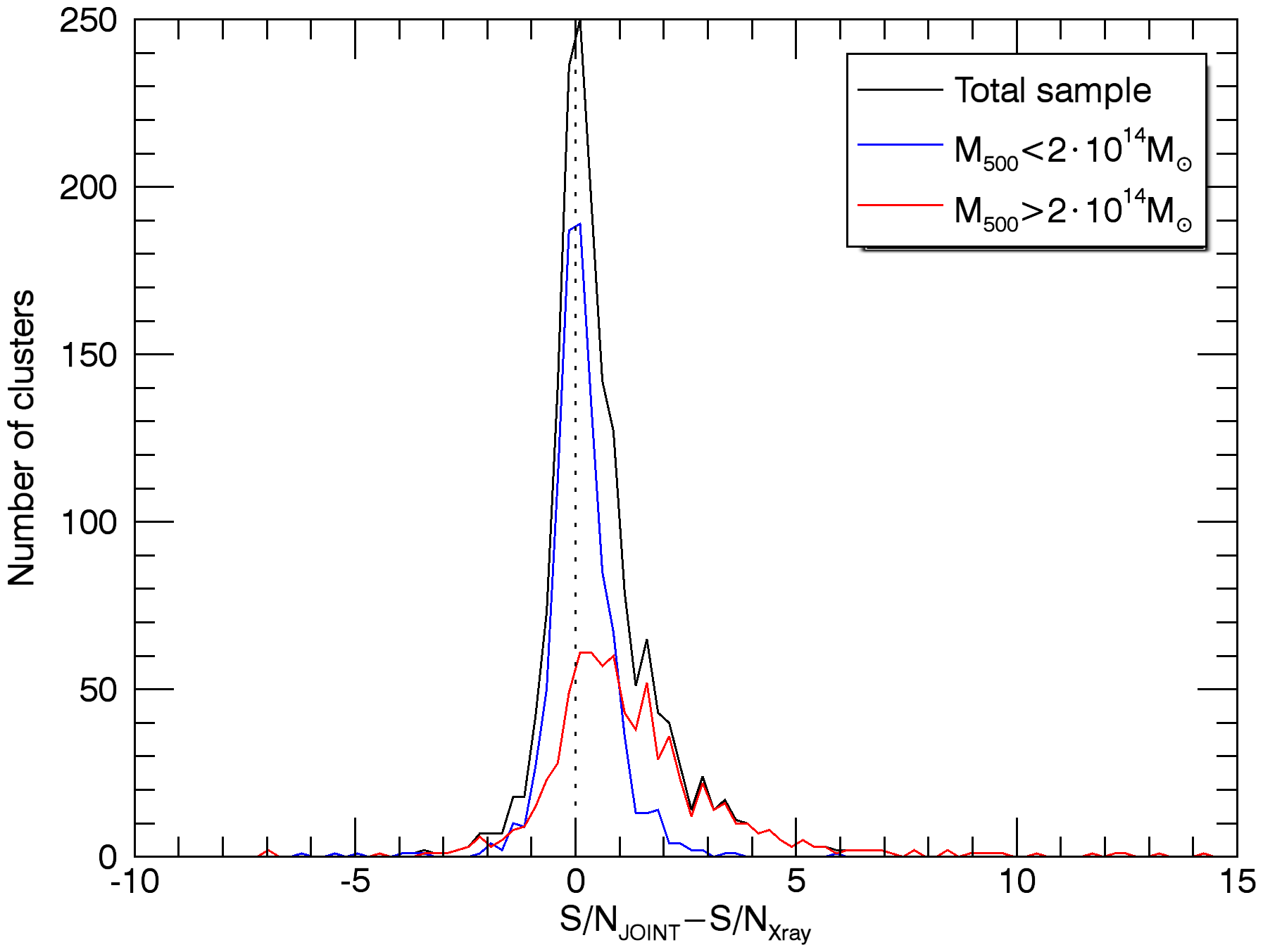 Histograms of the S/N gain of the joint extraction of the MCXC clusters (panels a)–d)) and the PSZ2 clusters (panels e)–h)) with respect to the individual SZ-only and X-ray-only extractions. The upper panels show the histogram of the difference between the S/N of the joint extraction and the S/N of the SZ-only extraction, on two redshift bins a) and two mass bins b), for the MCXC clusters. The panels in the second row show the histogram of the difference between the S/N of the joint extraction and the S/N of the X-ray-only extraction, on two redshift bins c) and two mass bins d), for the MCXC clusters. The four bottom panels are analogous to panels a)–d), but for the PSZ2 clusters. In all the cases, the S/N is defined as the estimated flux divided by the estimated background noise.