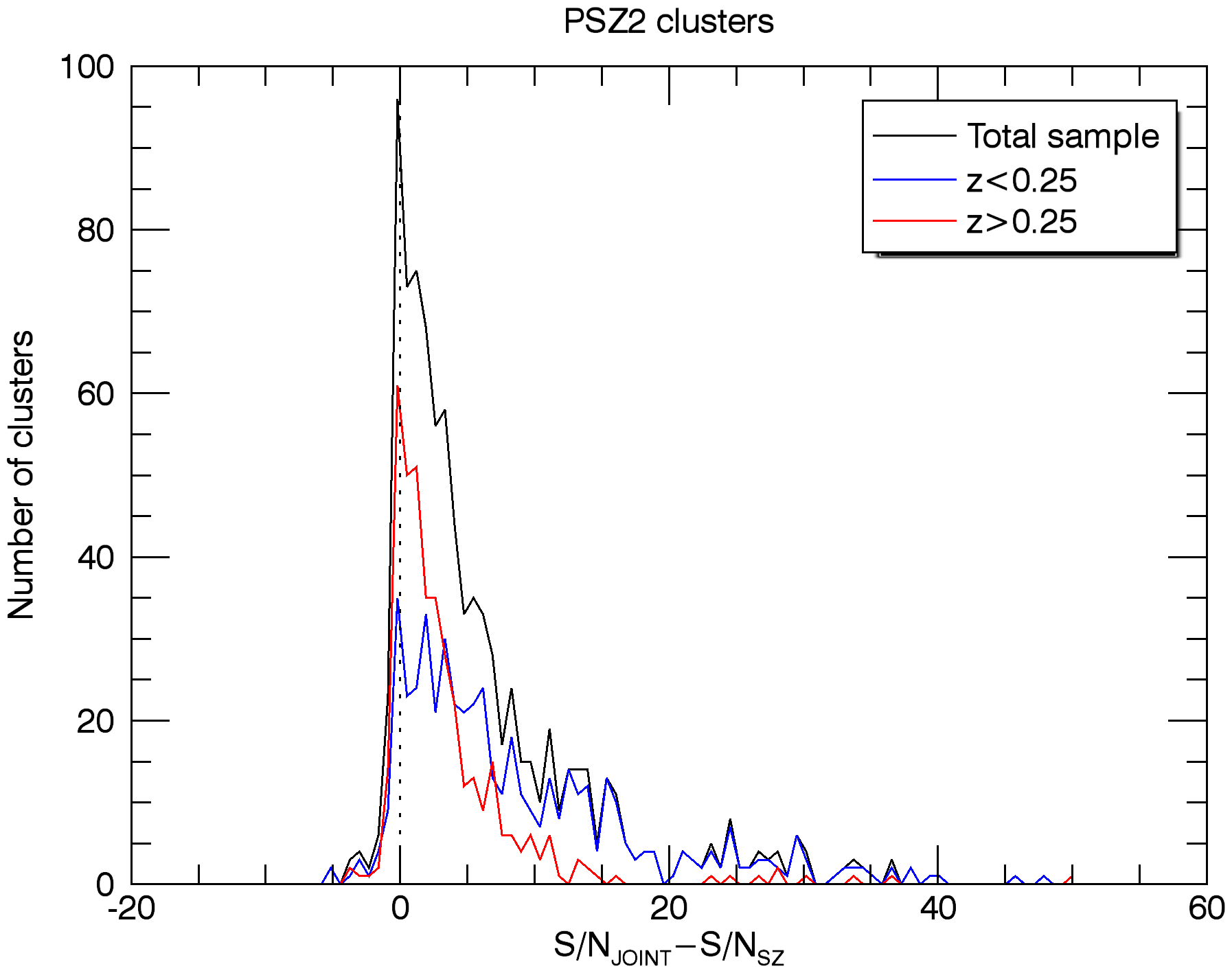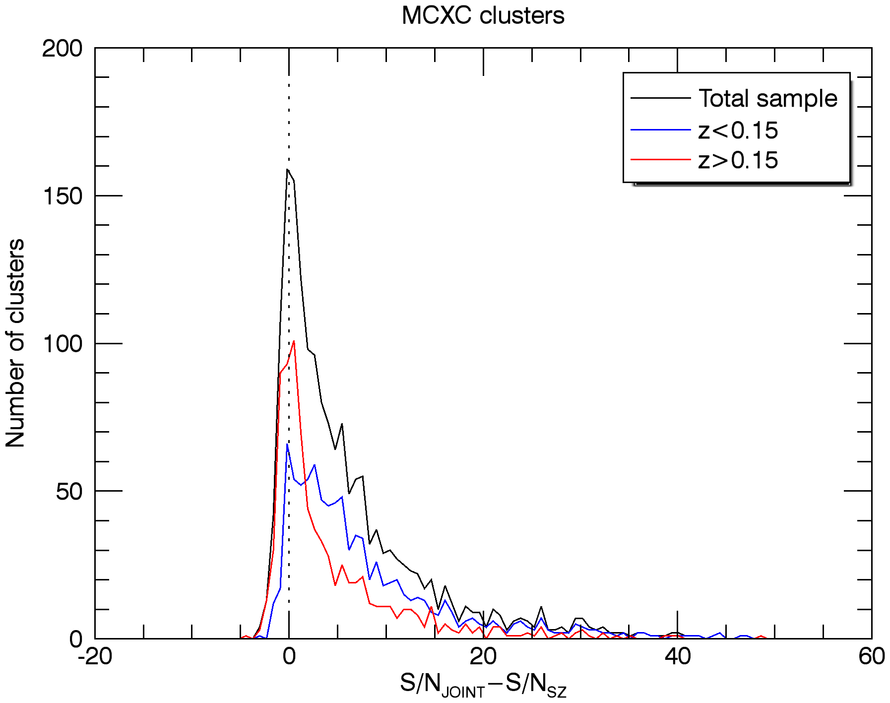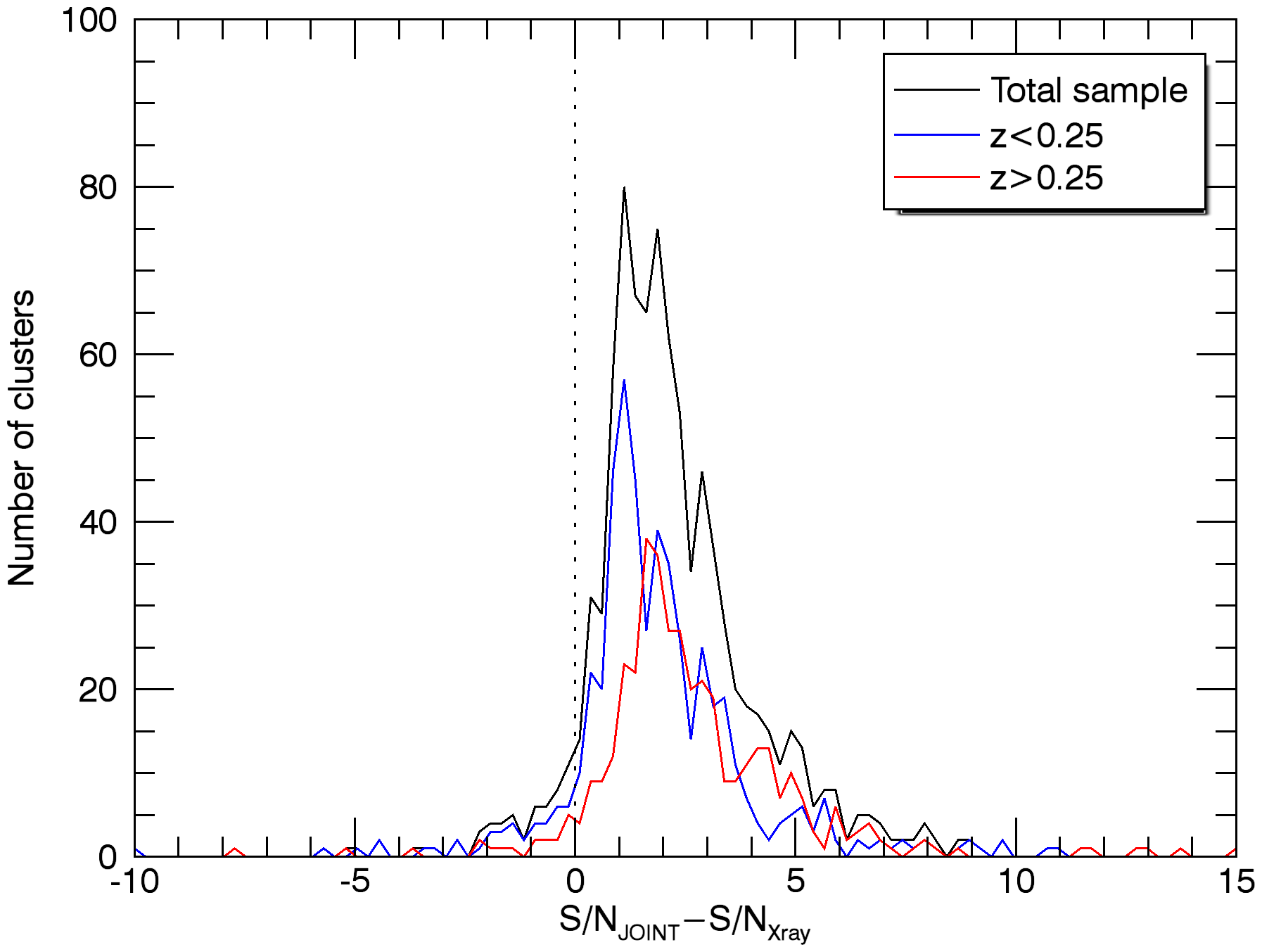 Histograms of the S/N gain of the joint extraction of the MCXC clusters (panels a)–d)) and the PSZ2 clusters (panels e)–h)) with respect to the individual SZ-only and X-ray-only extractions. The upper panels show the histogram of the difference between the S/N of the joint extraction and the S/N of the SZ-only extraction, on two redshift bins a) and two mass bins b), for the MCXC clusters. The panels in the second row show the histogram of the difference between the S/N of the joint extraction and the S/N of the X-ray-only extraction, on two redshift bins c) and two mass bins d), for the MCXC clusters. The four bottom panels are analogous to panels a)–d), but for the PSZ2 clusters. In all the cases, the S/N is defined as the estimated flux divided by the estimated background noise.