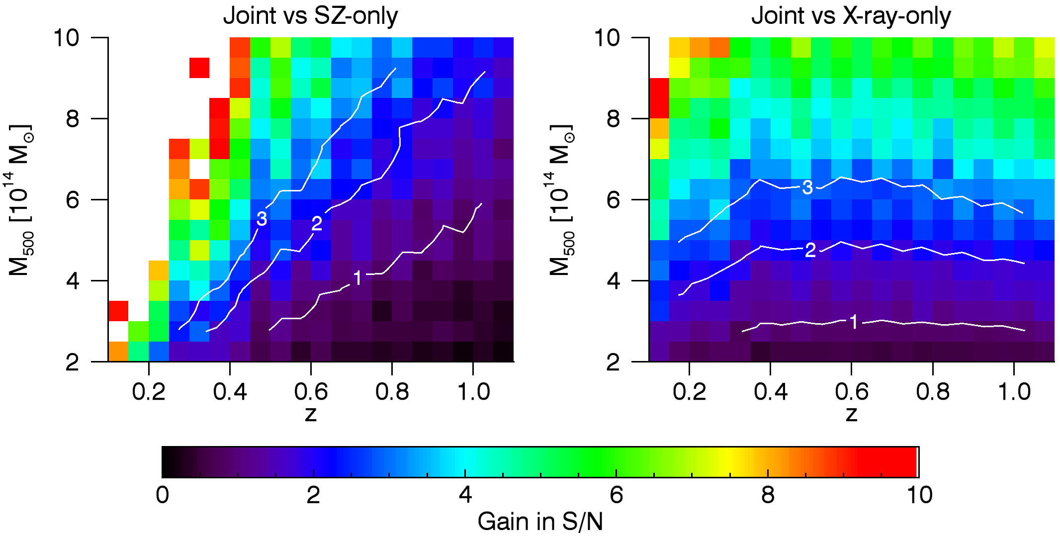 Top panels: S/N of the clusters extracted with the proposed X-ray matched filter (left panel), the classical SZ MMF (middle panel), and the proposed X-ray-SZ MMF (right panel), averaged in different mass and redshift bins. White lines indicate smoothed isocontours corresponding to a S/N of 3, 4, and 5. White bins indicate a S/N greater than 20. Bottom panels: average difference between the S/N obtained with the proposed X-ray-SZ MMF and the S/N obtained with SZ MMF (left panel) and the X-ray MF (right panel). White lines indicate smoothed isocontours corresponding to a difference in S/N of 1, 2, and 3. White bins indicate a difference in S/N greater than 10.