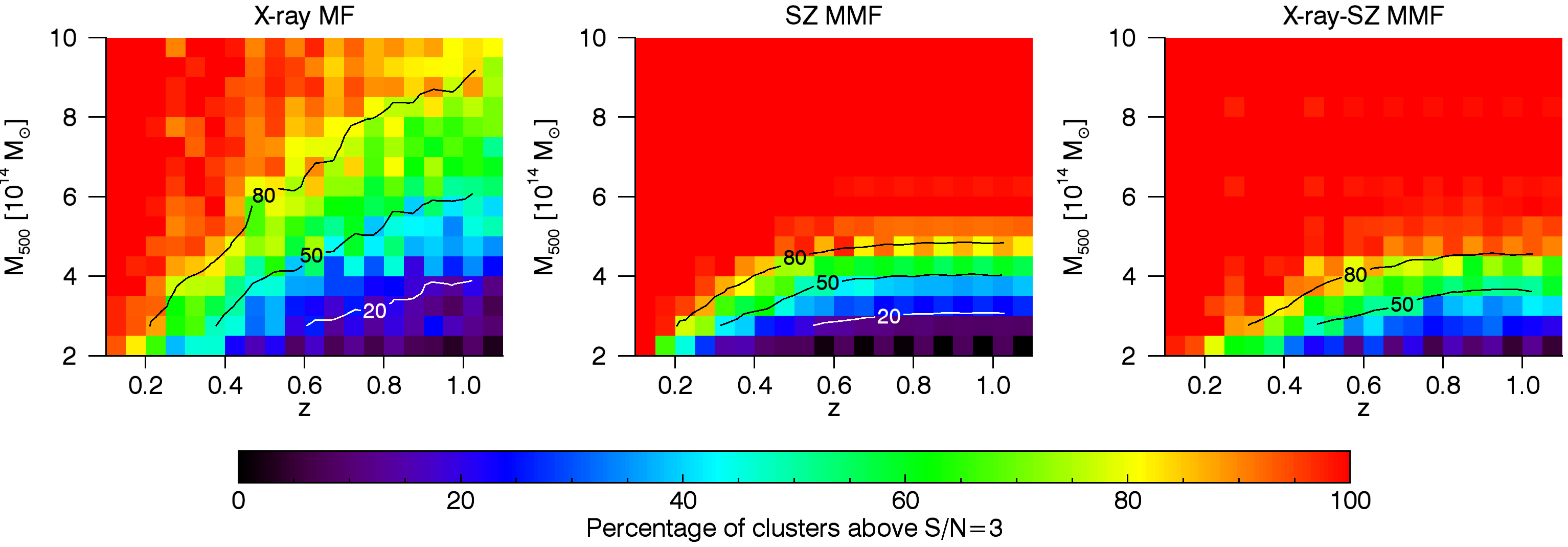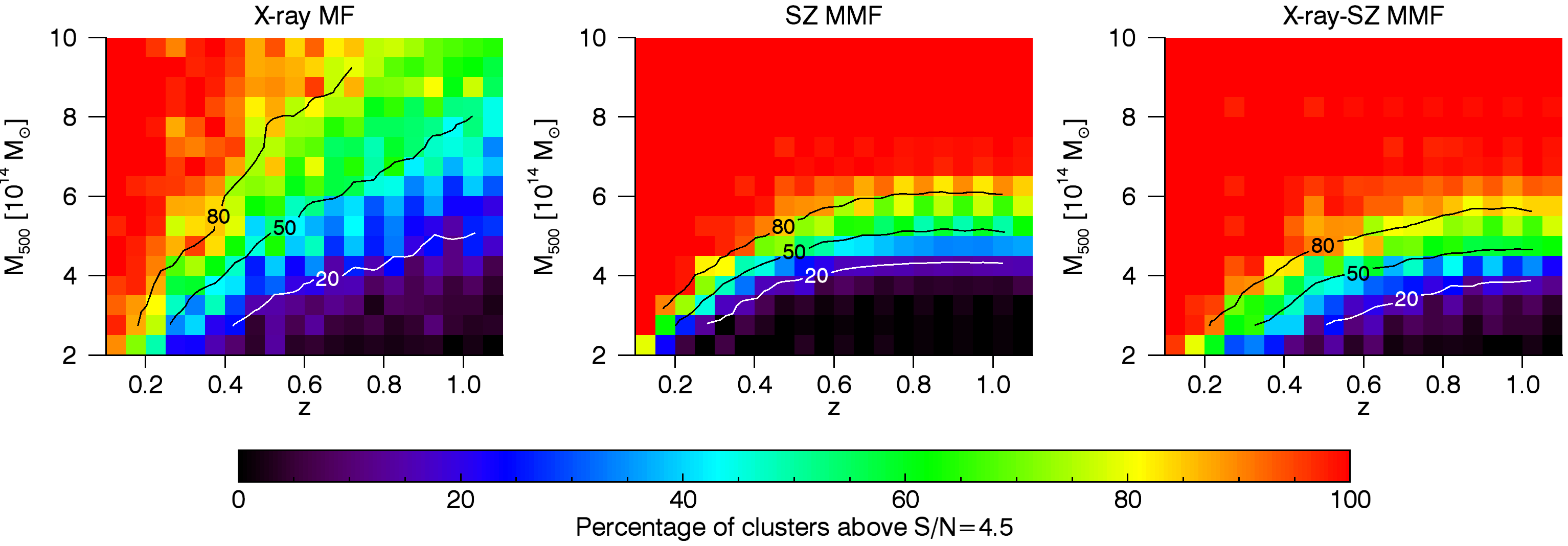 Estimated completeness of the proposed X-ray matched filter (left panels), the classical SZ MMF (middle panels) and the proposed X-ray-SZ MMF (right panels) for a S/N threshold of 3.0 (top panels) and 4.5 (bottom panels), in different redshift-mass bins.