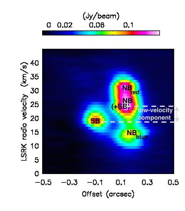 Position-velocity diagram of the NaCl 312 GHz for an axis length of 1′′ and an averaging width of 650 mas centred at α = 07h22m58.332s and δ = −25°46′03.̋053. In the left and middle panels, the slit has a PA of 50° (i.e. along the presumed polar/rotation axis; with north-east positions having negative offsets and south-west positions positive offsets), in the right panel the slit PA is 140° (i.e. along the presumed equatorial plane; with south-east positions having negative offsets and north-west positions positive offsets). In the left and right panels the different velocity components are indicated, while in the middle and right panels the main contributors to the different intensity peaks are indicated. The contours in the left panel are at [1,2,...10] × 0.01 Jy/beam.