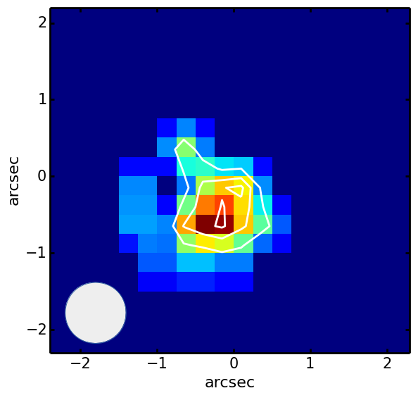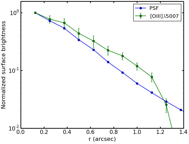 Top left: H-band spectra of XID5330 around the [O iii] λ4959, 5007 lines extracted from a region of 1′′× 1′′ centred at the QSO position. The observed spectrum in shown in black and the full fit model is shown in red. Owing to low S/N on the spectra, only a single Gaussian component was used for line fitting. The lower panel shows the residuals of the line fit. Top right: map tracing the Gaussian component in the [O iii] λ5007 profile of XID5330. The white contours show the continuum levels at 50%, 75%, and 95%. Each pixel corresponds to a spatial scale of 0.25′′ (~2.12 kpc). North is up and east is left. The grey circle on the lower left shows the size of PSF. Bottom panel: surface brightness profile of the narrow component of the map in the top right panel compared to the PSF profile. The [O iii] λ5007 emission is extended up to 1.1′′ (~9.5 kpc).