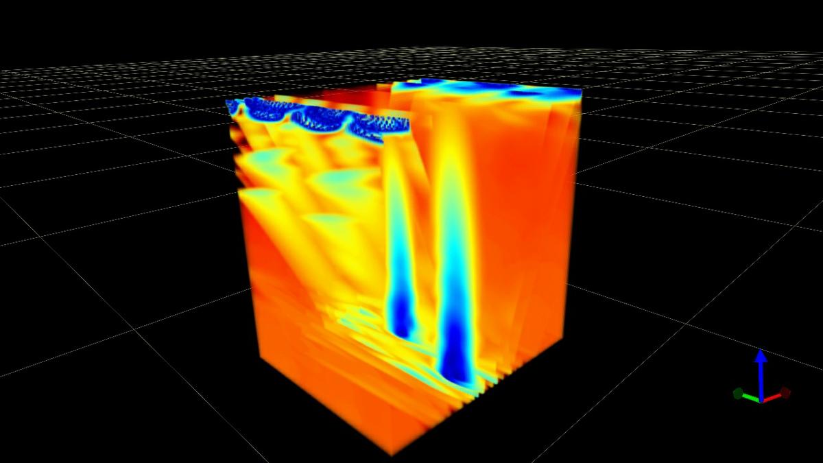 3D distribution of the vorticity in a fully stratified disk, after 250, 400 and 445 rotations (from top to bottom, respectively). The colored arrows correspond to the radial (red), the azimuthal (green) and to the vertical (blue) directions.