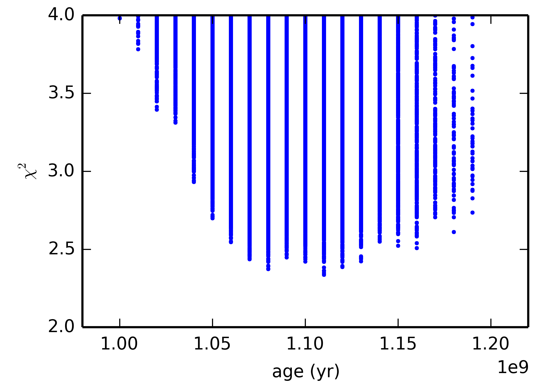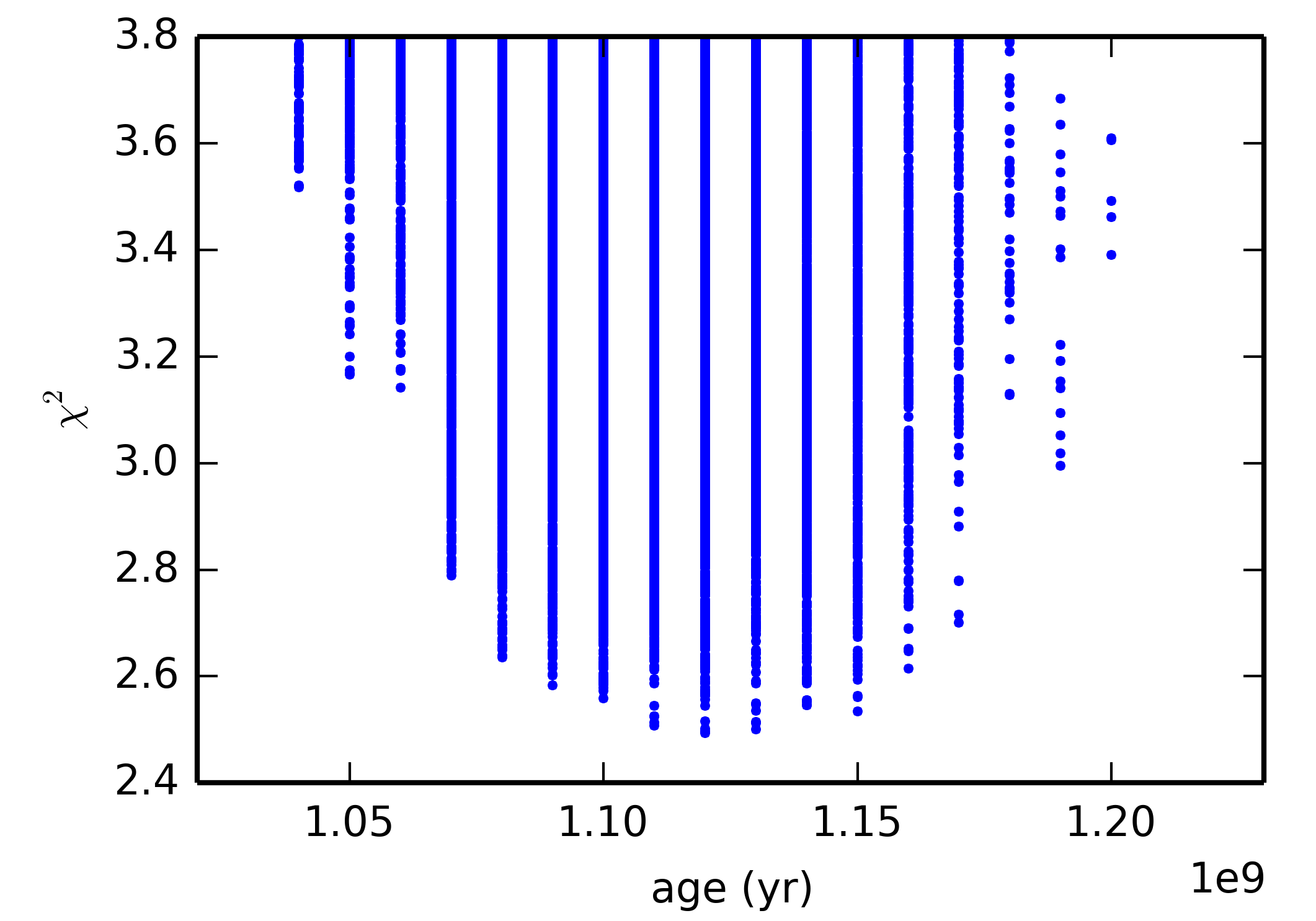 Chi-squared distribution of age for all coeval models in the two denser grids, which fall within 2σ of the HRD position of both stars and have equal composition.