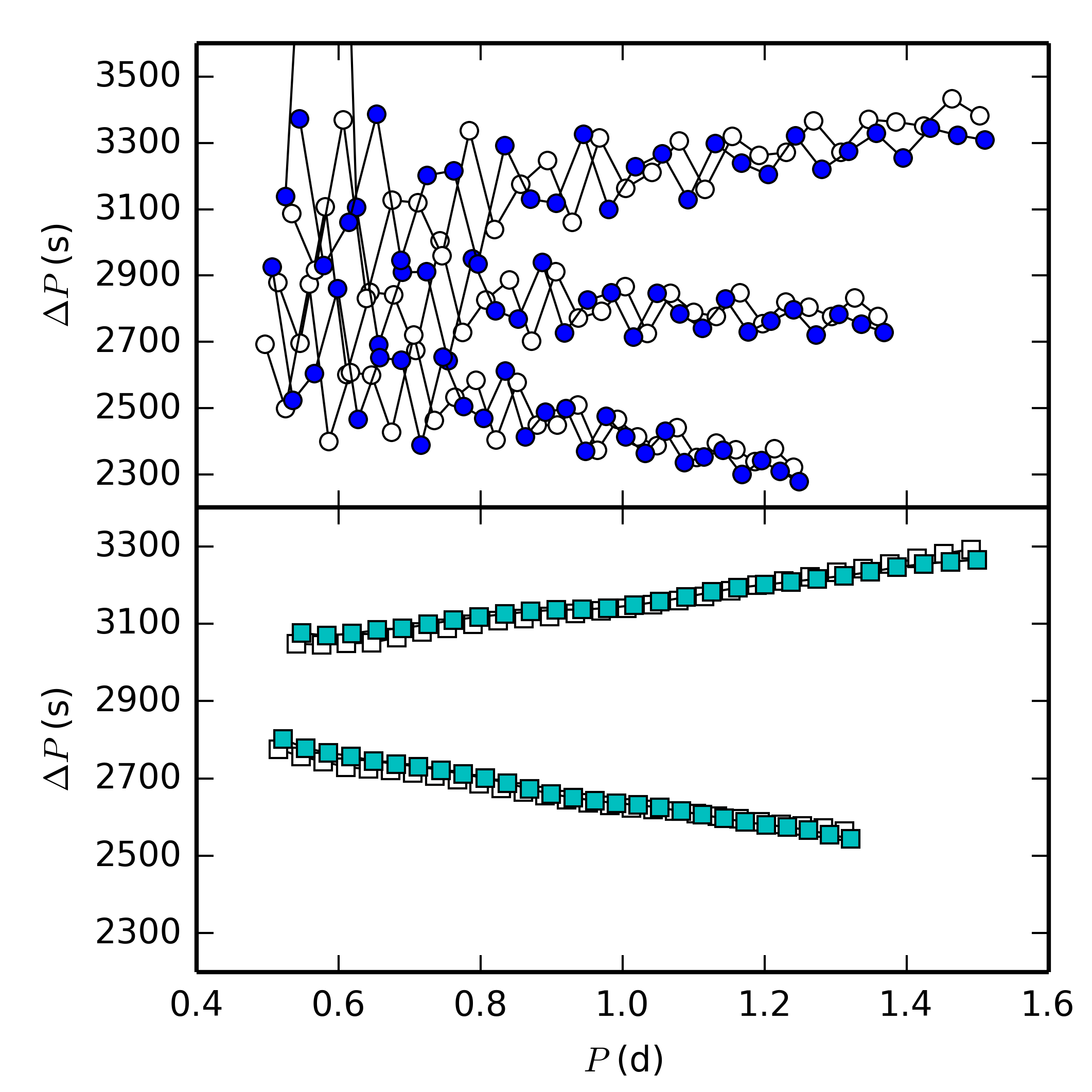 Difference between first-order perturbation approximation and TAR for the rotation rates Ωc,1 = 0.13963 d-1 and Ωc,2 = 0.09034 d-1. GYRE zonal modes with a Ledoux shift applied are shown as the empty symbols and GYRE modes calculated using the TAR are shown as the filled symbols, where the primary is in dark blue and the secondary in light blue.
