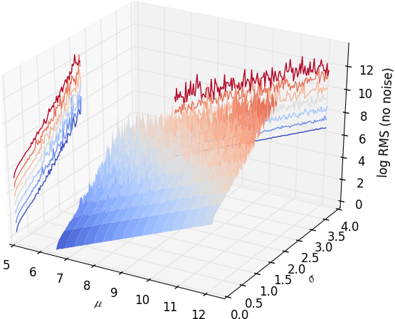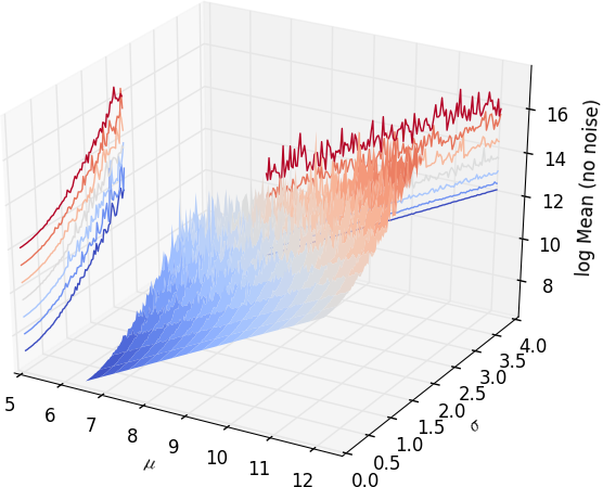 Top: estimated mean L250 as a function of the intrinsic population mean (μ) and standard deviation (σ) of log L250. For each set of (μ, σ), we generate ~2000 random numbers representing the 250 μm luminosities drawn from the log-normal distribution specified by (μ, σ). The estimates of the mean 250 μm luminosity