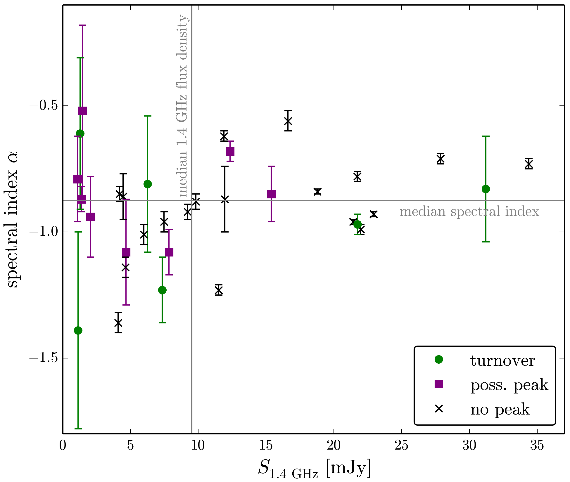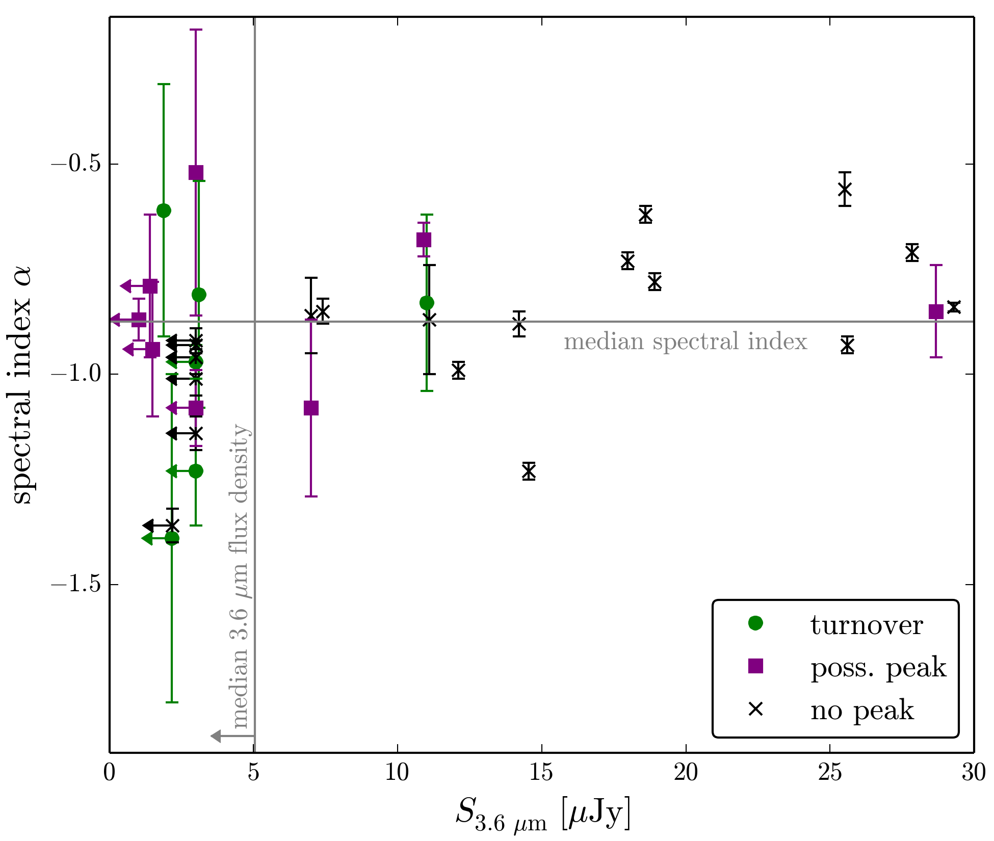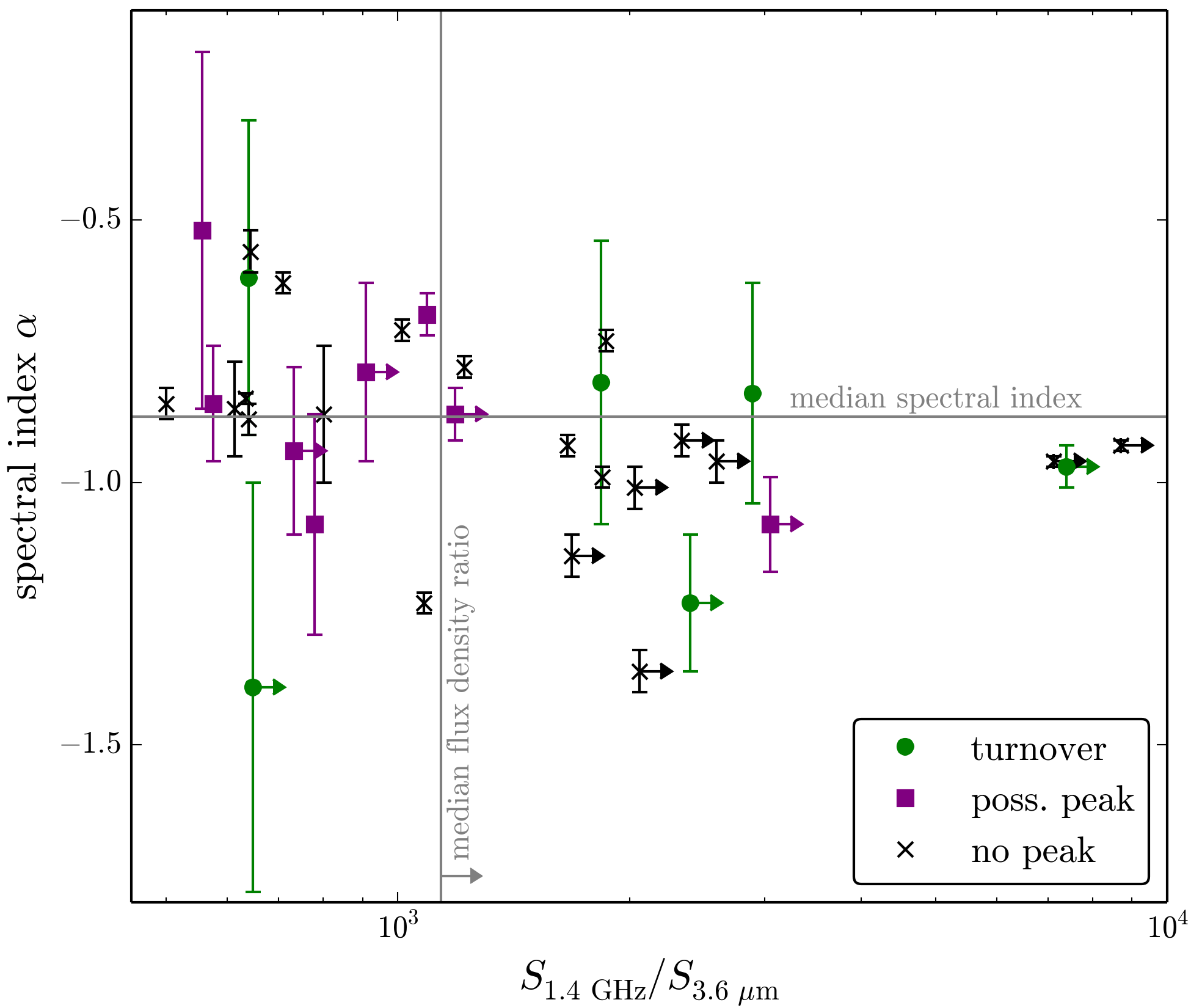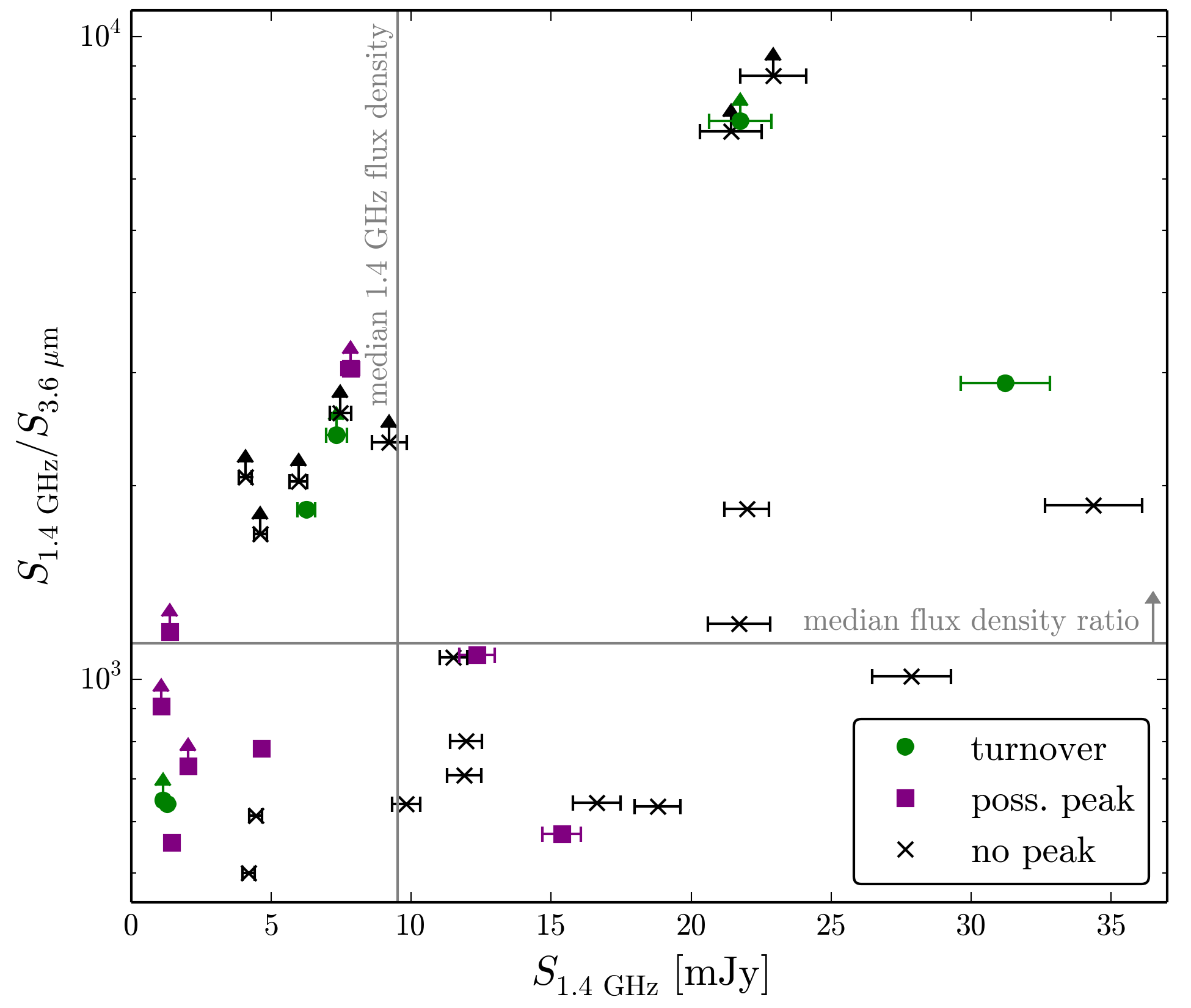 Radio spectral index α as a function of the 3.6 μm flux density (top left), α as a function of the radio flux density S1.4 GHz (top right), α as a function of the radio-to-IR flux density ratio S1.4 GHz/S3.6 μm (bottom left), and S1.4 GHz/S3.6 μm as a function of S1.4 GHz (bottom right) for our sample of 34 IFRS. The symbols distinguish subsamples of different turnover properties. Green dots represent sources with a detected turnover. Sources with a possible peak are shown by purple squares, and sources without a peak by black crosses. The classification is described in Sect. 3 and summarised for individual IFRS in Table 3. Upper and lower limits are represented by arrows. The grey horizontal and vertical lines indicate the medians or limits of the median.