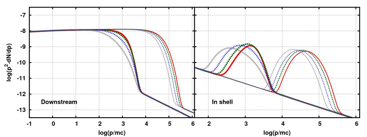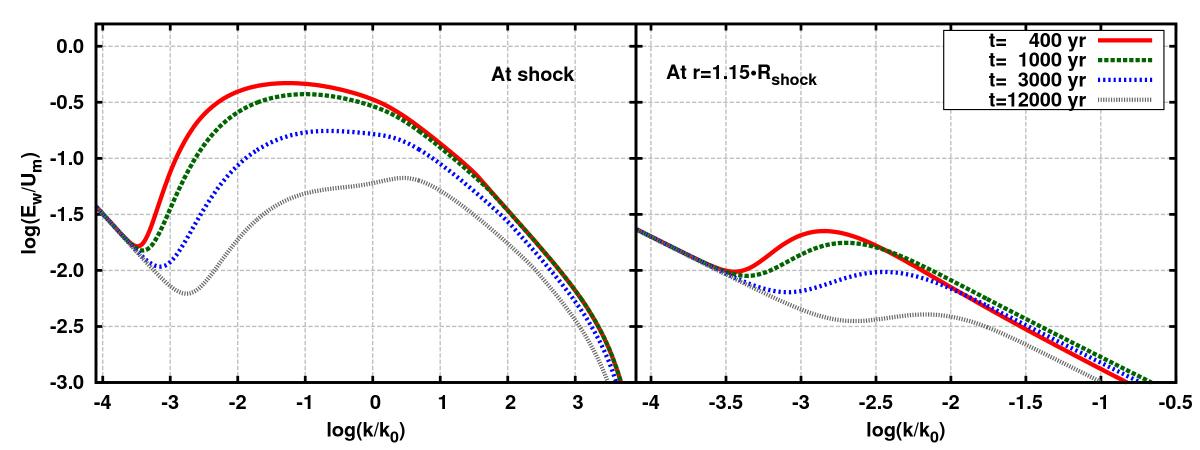 Spectral evolution of turbulence energy density, Ew (top), and differential proton number density, N (bottom), for an SNR in the adiabatic stage at the age of 400 (red), 1000 (green), 3000 (blue) and 12 000 (gray) yr. Both the self-consistent treatment (thick lines) and Bohm-like diffusion (thin lines) are presented. Spectra for the location at r = 1.15 Rshock are averages over a shell with thickness 0.5 pc. Particles with kinetic energy of 1 GeV are resonant with waves of wavenumber k0.