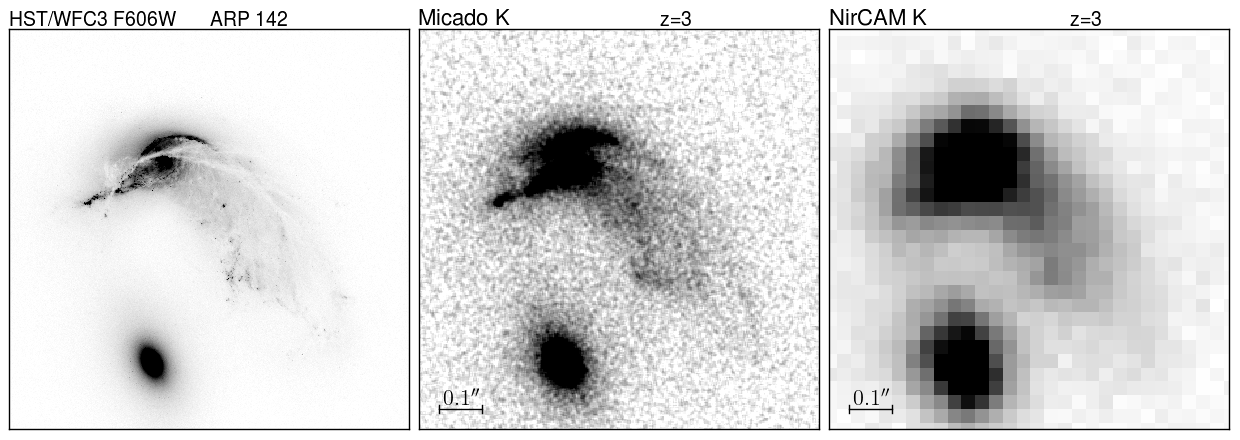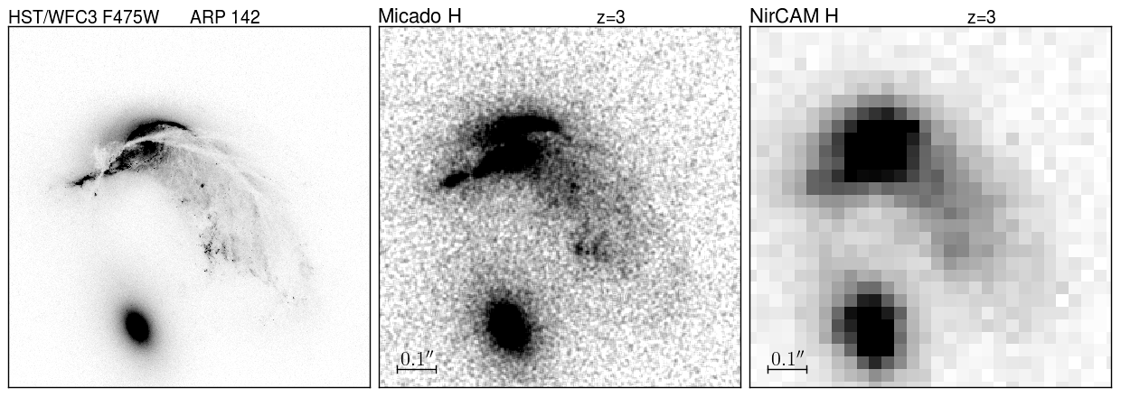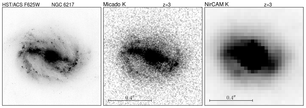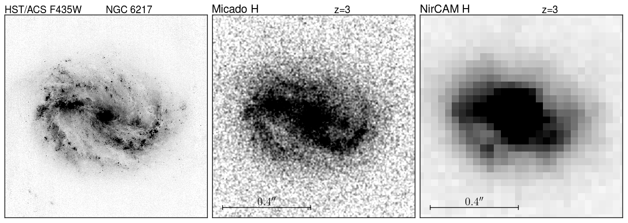Simulations of MICADO (central panels) and NIRCam (right panels) H- and K-band observations of galaxies at z ~ 3 obtained using HST observations of nearby galaxies as templates (left panels.)