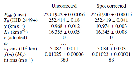 Notes. The elements are for the unaltered RV data (Col. “Uncorrected”) and for starspot-jitter removed data (Col. “Spot corrected”).
