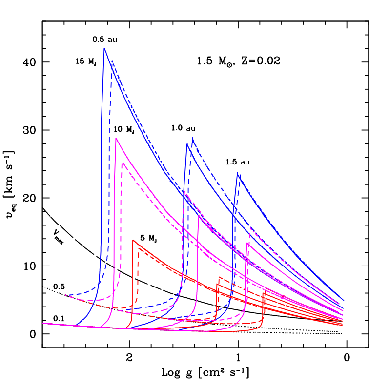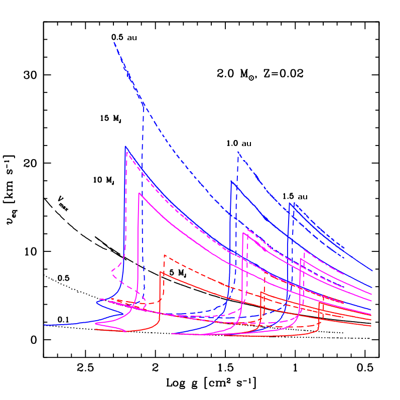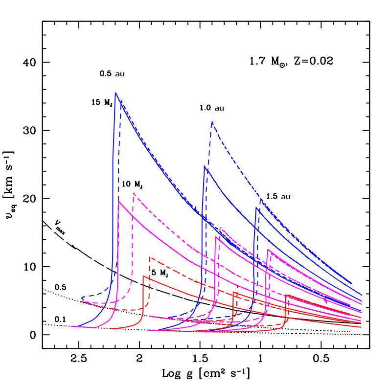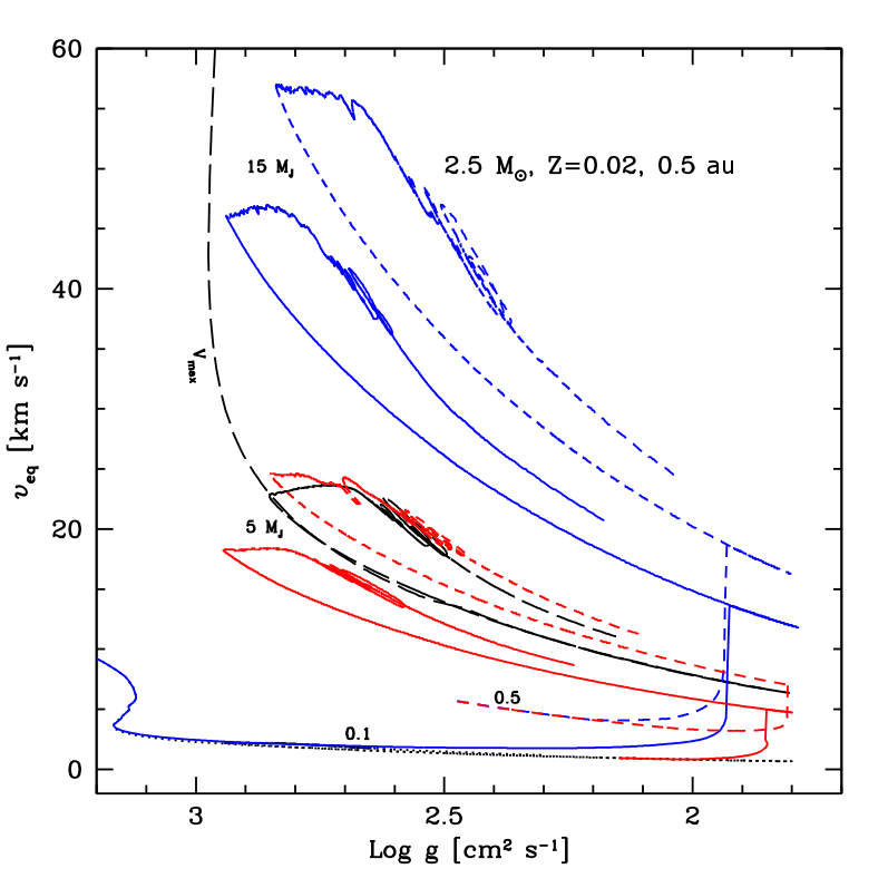 Evolution of the surface velocity as a function of the logarithm of the surface gravity. Dotted (black) lines are for stars without engulfment. Cases for Ω / Ωini = 0.1 and 0.5 are shown. The black long-dashed line (labelled Vmax) corresponds to solid body rotation without engulfment starting with an initial rotation near the critical velocity (see text). Continuous lines correspond to cases with planet engulfment for stars with an initial velocity equal to 10% the critical value and the short-dashed lines correspond to the same cases but for an initial rotation equal to 50% of the critical value. The different colours for solid and dashed lines are for planet masses of 5 (red), 10 (magenta), and 15 MJ (blue) and initial orbital distances of 0.5, 1, and 1.5 au from left to right (see labels). The different panels are for different values of the mass of the star. In the case of 2.5 M⊙, the evolution is pursued until the end of the core He-burning phase, while for lower initial mass stars, the evolution is stopped at the tip of the red giant branch.