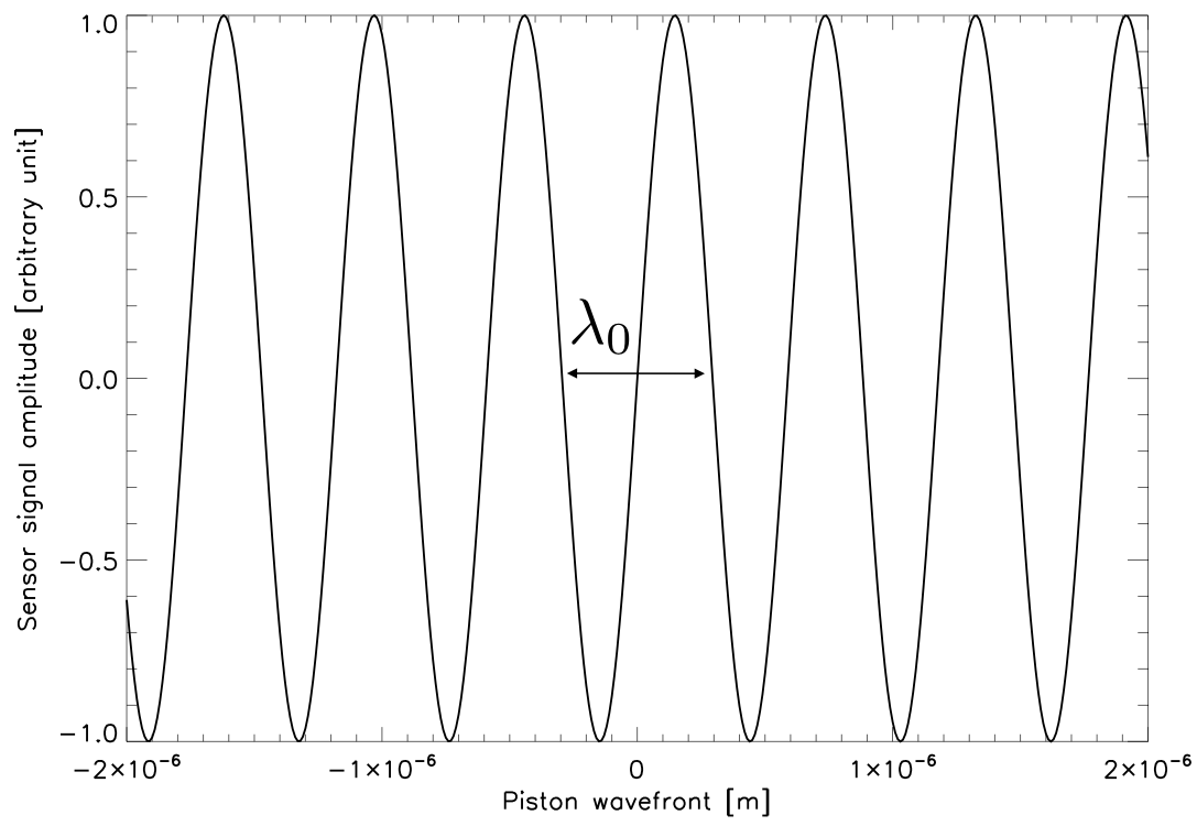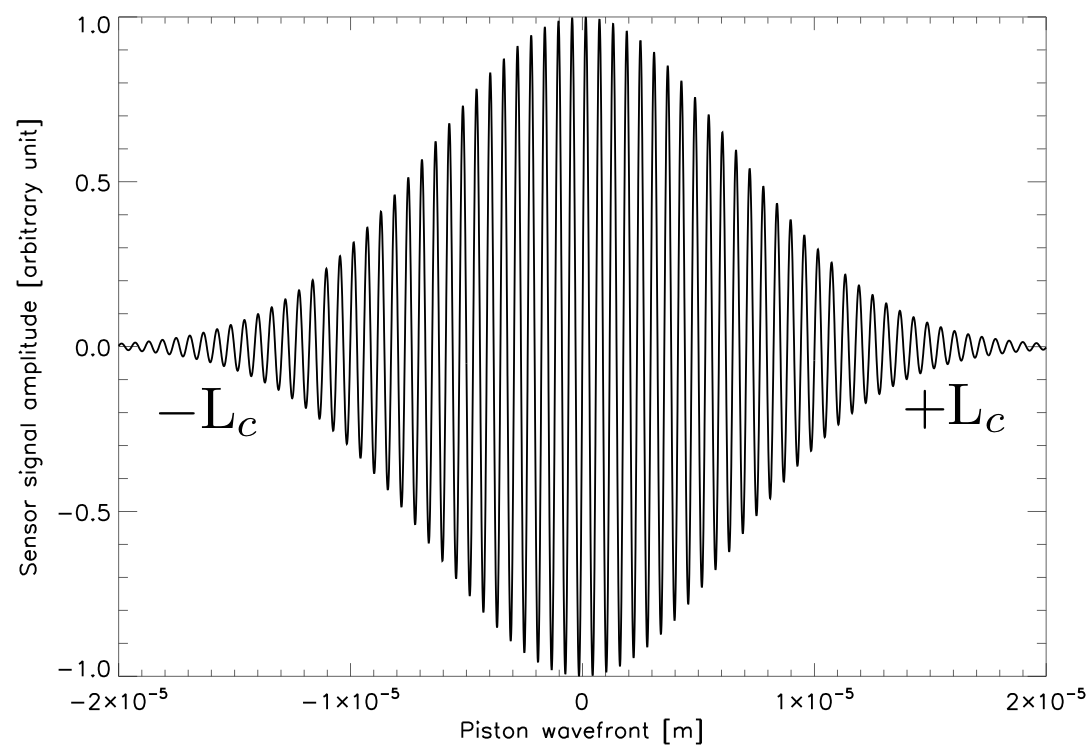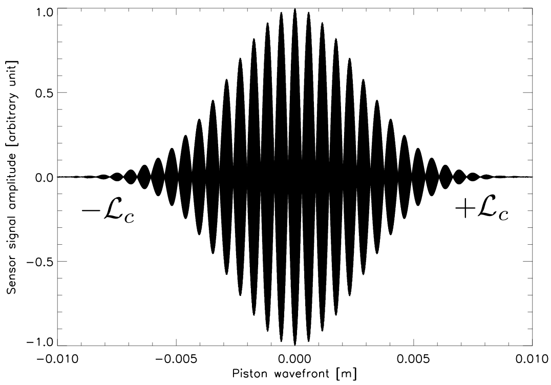 Cophasing sensor signal as a function of the wavefront step: in the monochromatic regime (top) intrinsically limited by the π-ambiguity, using the coherence method (middle) with an extended capture range of ±Lc, and using the doublet-wavelength coherence method (bottom) with a broad capture range limited to ±ℒc.