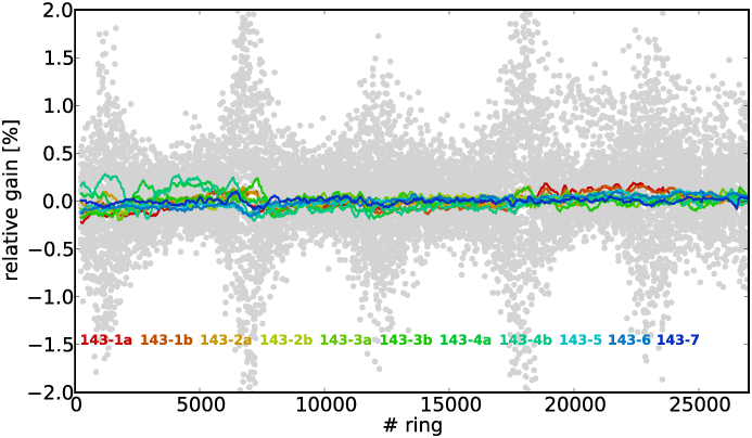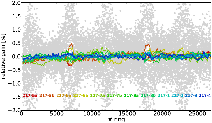 Gain variation with ring number for each bolometer estimated using bogopix. From top to bottom: 100, 143, and 217 GHz. Gain values for individual rings (grey dots) have been smoothed with a four-day width. The gain variations are lower than 0.3, 0.4, and 0.5% at 100, 143, and 217 GHz, respectively.