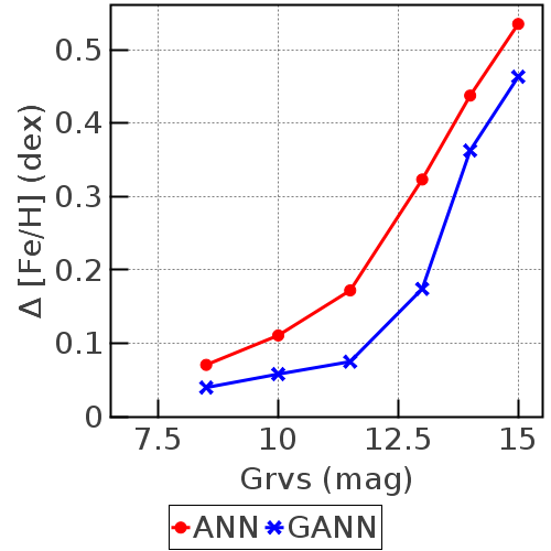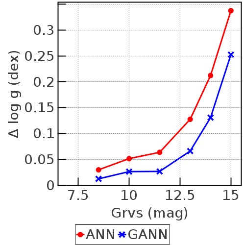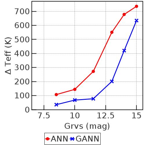 68th percentile of residuals obtained by both ANNs and GANNs for early type stars sample: Teff ∈ [7500,11500], log g ∈ [2,5], and [Fe/H] ∈ [−2.5,0.5].
