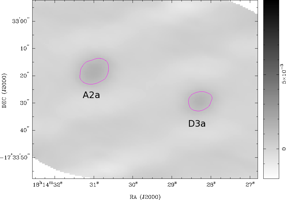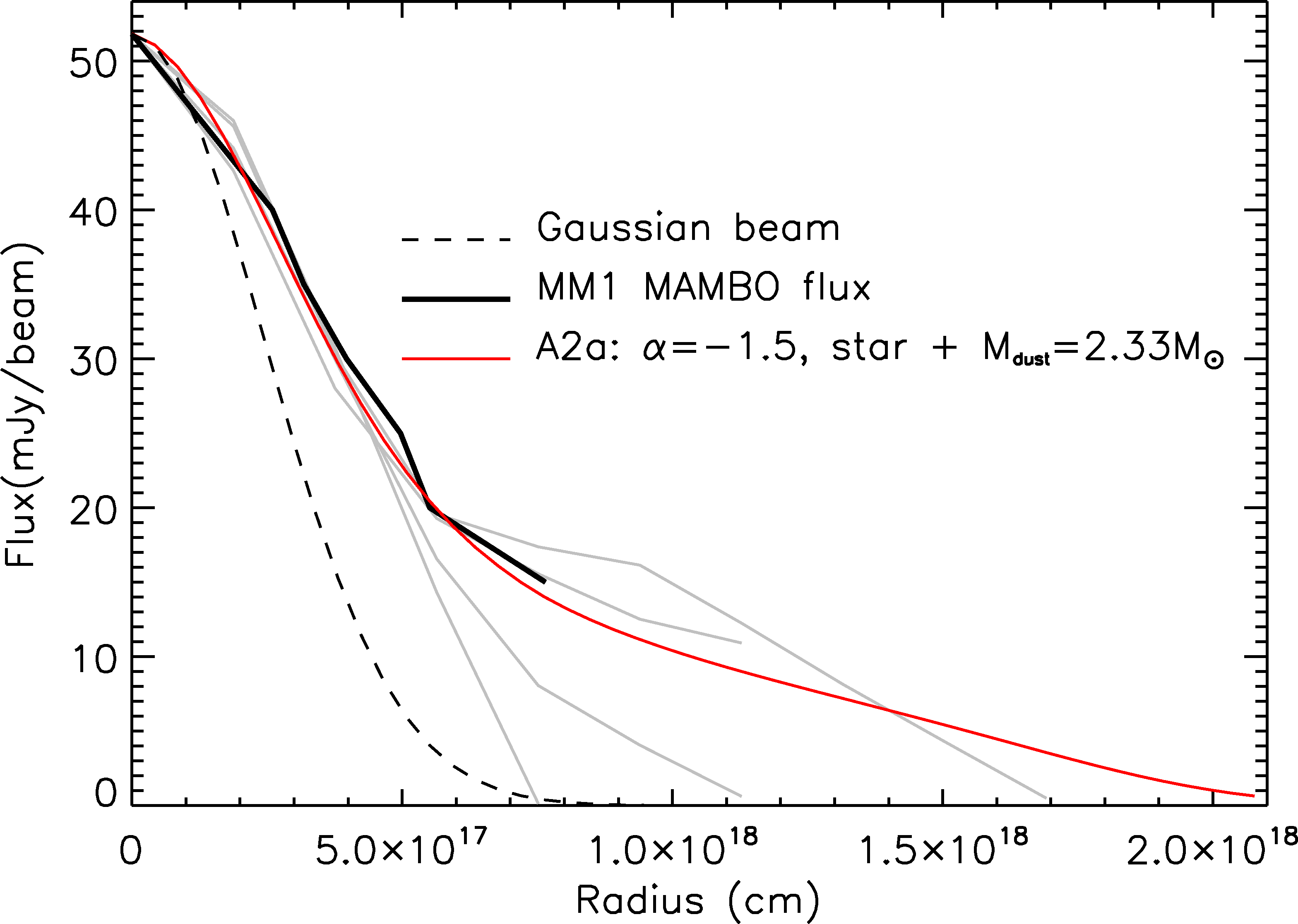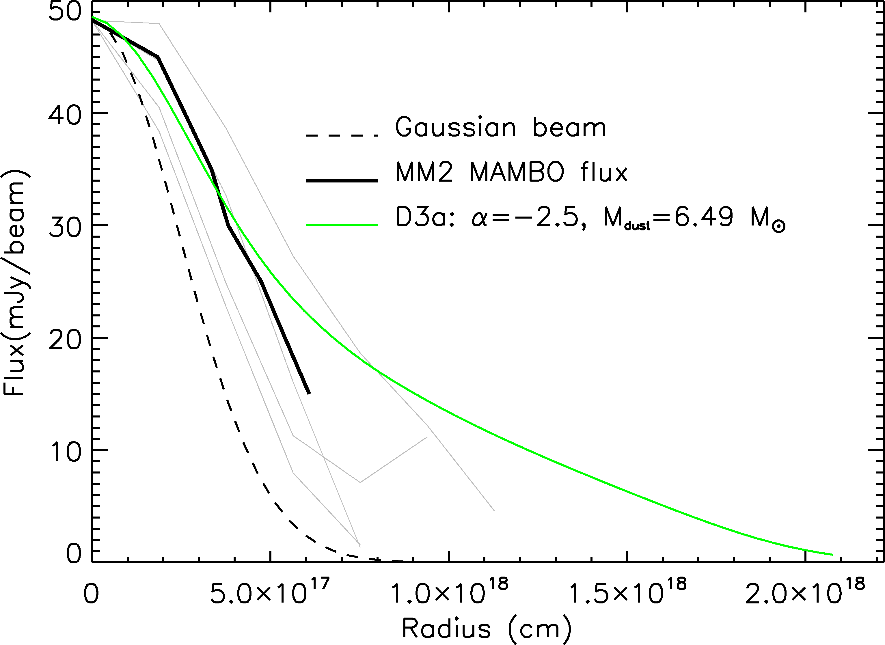 CASA simulated SMA 1.3 mm continuum map of the SDC13 region (bottom) made using RADMC-3D models A2a (top) and D3a (centre; see Table 4). The map contour is at 1.5 mJy. The rms noise in the centre of the map ~0.09 mJy. Model fluxes for A2a (shown in red) and D3a (shown in green) are compared with plots of the observed MAMBO 1.2 mm flux against equivalent radius for MM1 and MM2 respectively (solid black lines). Model parameters are given in the key of each plot. The grey lines in the top two plots indicate perpendicular slices of observed flux against radius; these slices give an indication of the range of variation in the observed flux distributions in MM1 and MM2. The dashed curves indicate the MAMBO beam (FWHM = 10.7′′).