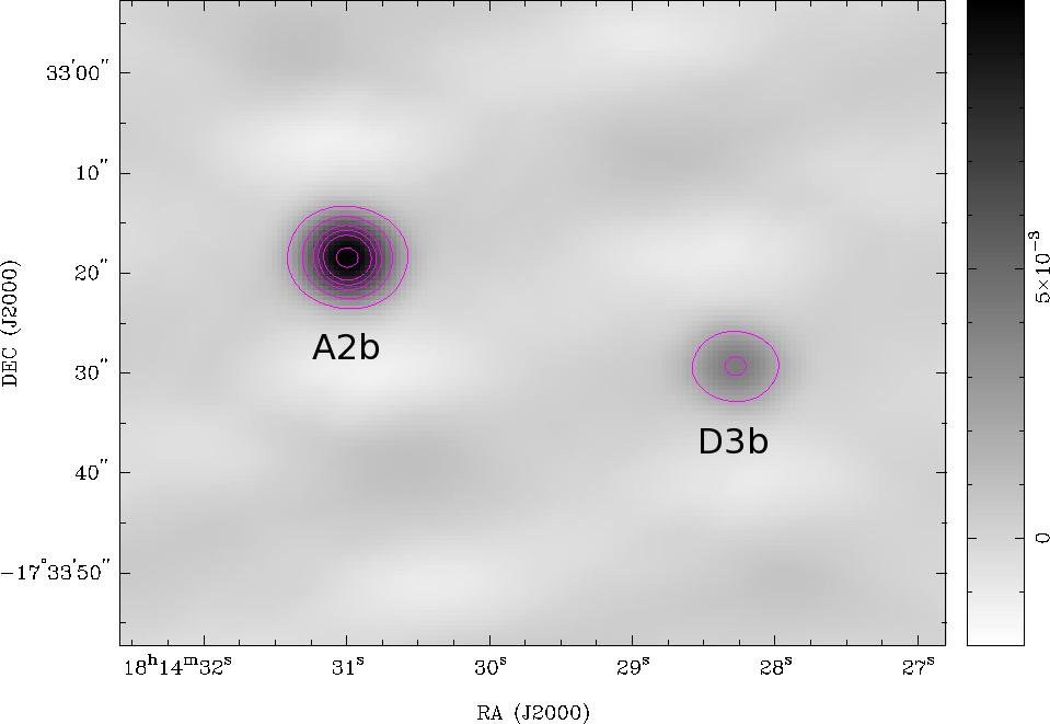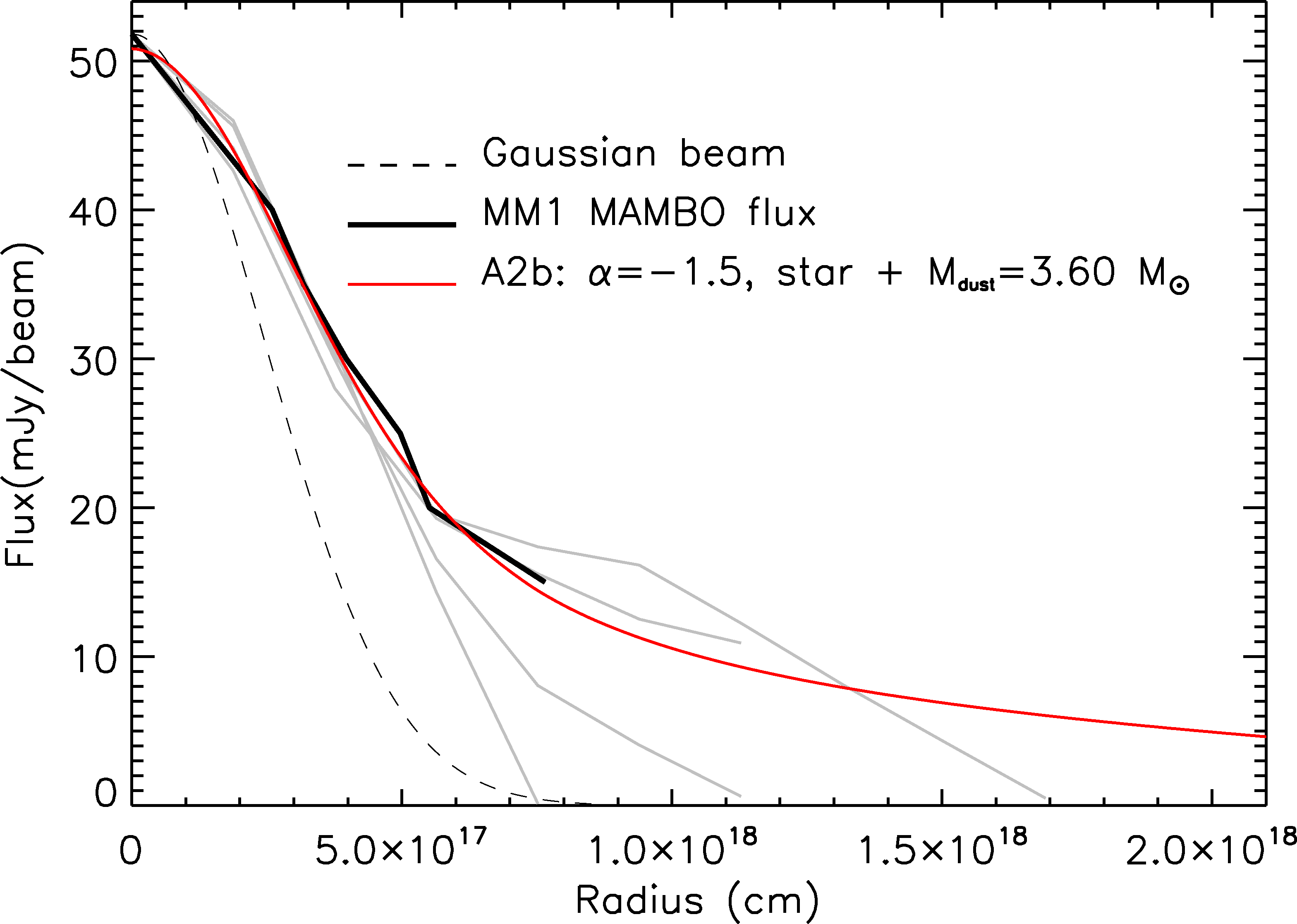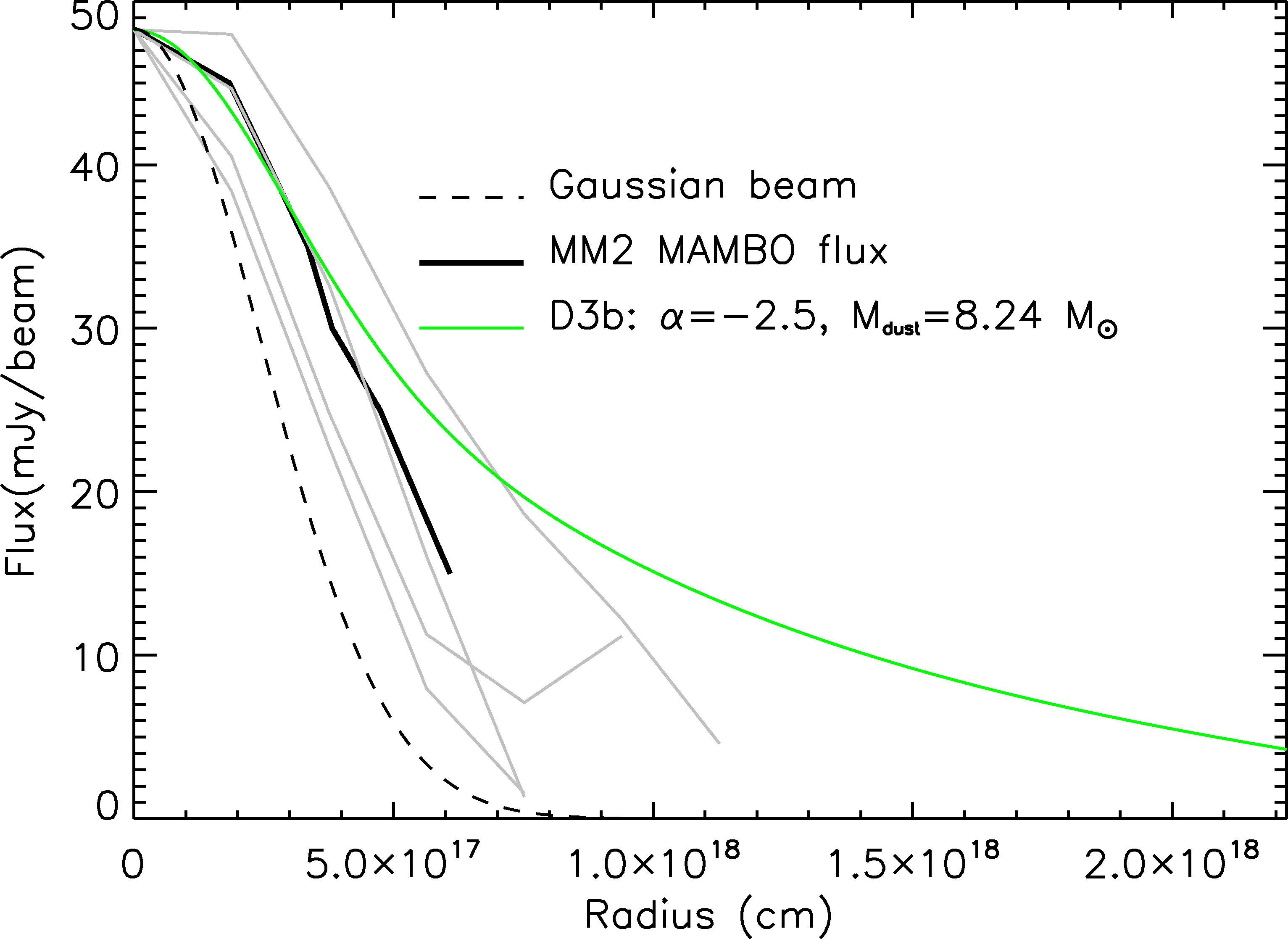CASA simulated SMA 1.3 mm continuum map of the SDC13 region (bottom) made using RADMC-3D models A2b (top) and D3b (centre; see Table 4). Map contours are at 2, 4, 6, 8 and 10 mJy. The rms noise in the centre of the map ~0.3 mJy. Model fluxes for A2b (shown in red) and D3b (shown in green) are compared with plots of the observed MAMBO 1.2 mm flux against equivalent radius for MM1 and MM2 respectively (solid black lines). Model parameters are given in the key of each plot, with further details given in the text. The grey lines in the top two plots indicate perpendicular slices of observed flux against radius; these slices give an indication of variation in the observed flux distributions in MM1 and MM2. The dashed curves indicate the MAMBO beam (FWHM = 10.7′′).
