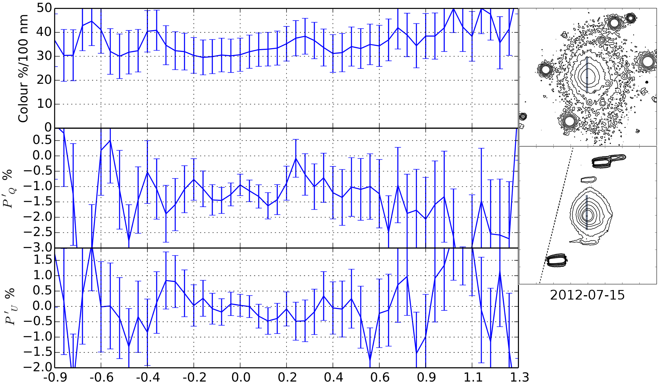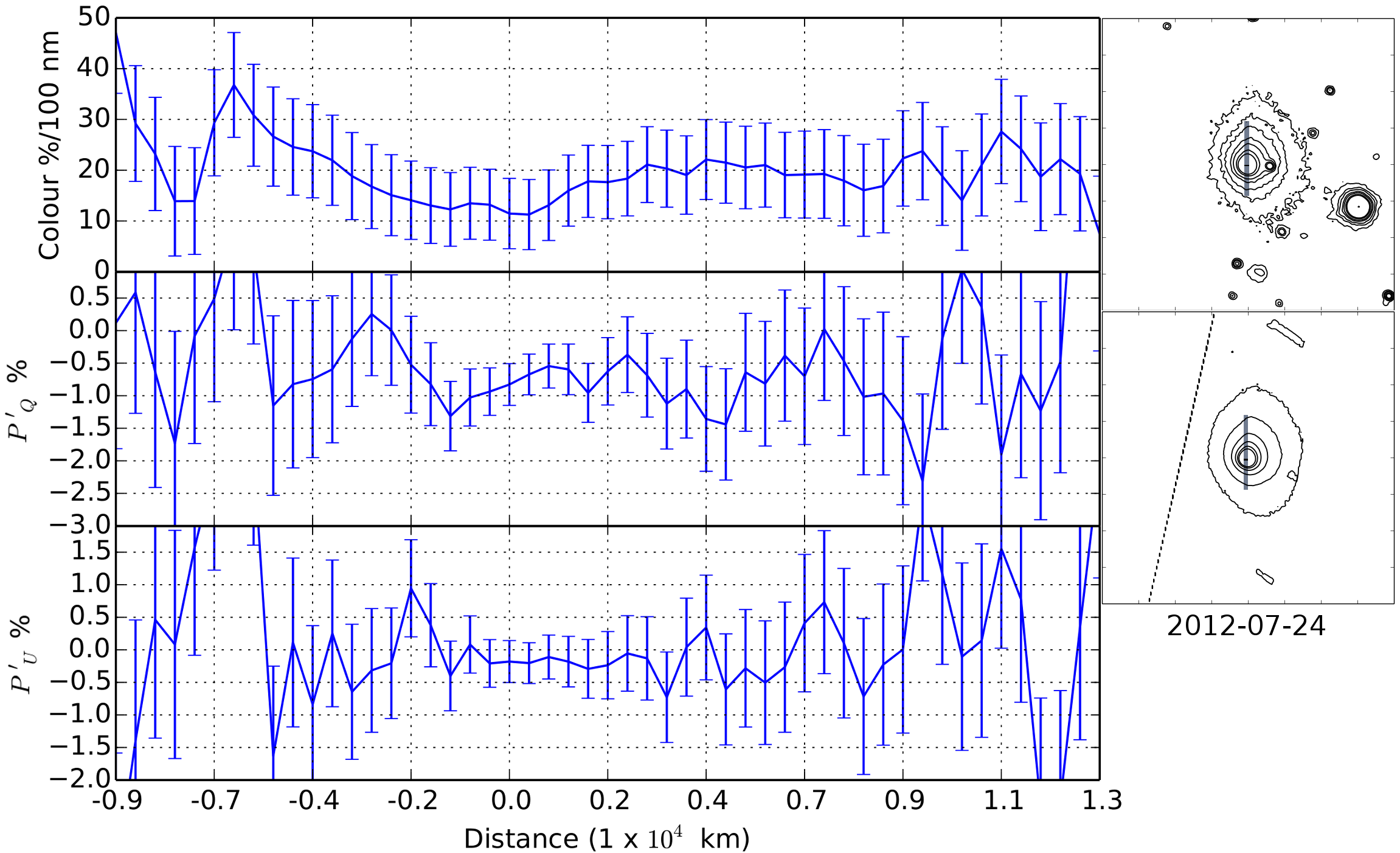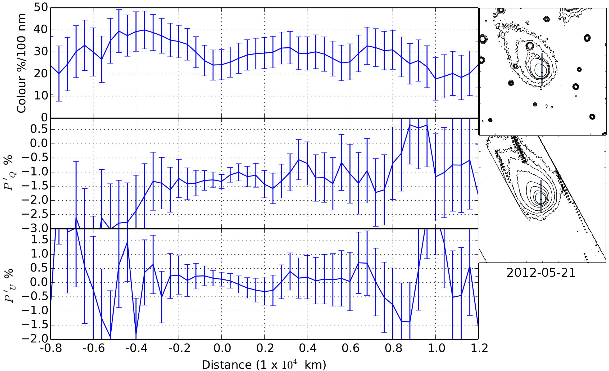 along the solar anti-solar direction. Positive distance is in the anti-solar direction, and negative distance is in the solar direction. Zero is at the photometric centre of the comet. The upper contour plot shows the intensity of the comet in the photometric images and the lower contour plot shows the photometric intensity of the comet in the polarimetric images; the levels are arbitrary. The small grey shaded area in each contour plot shows the area scanned.