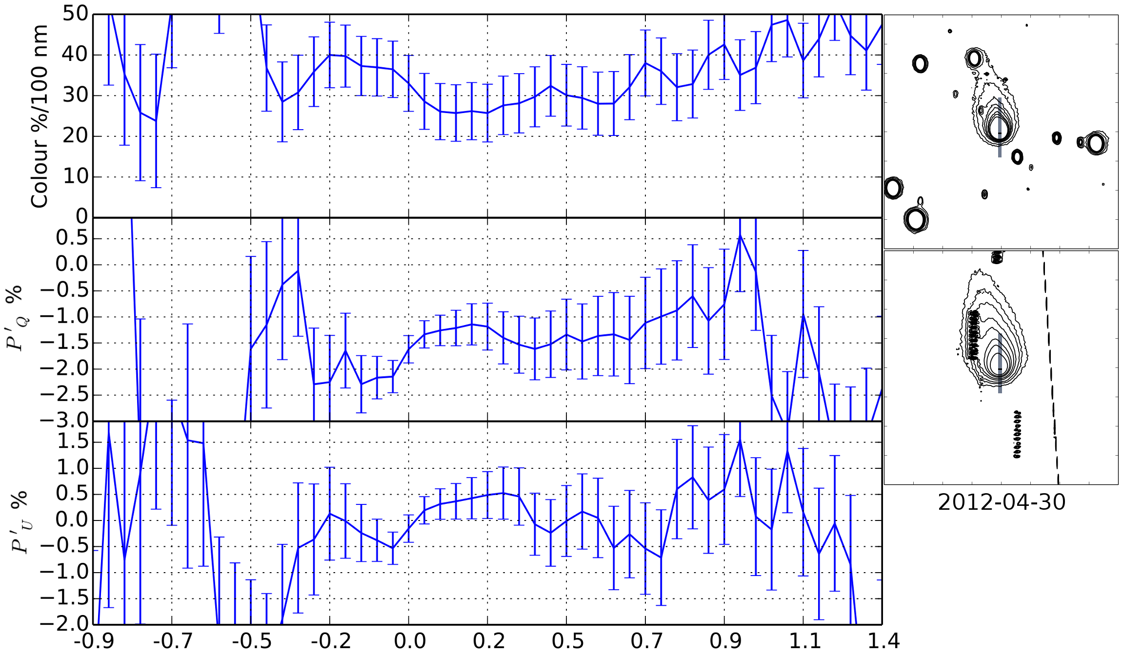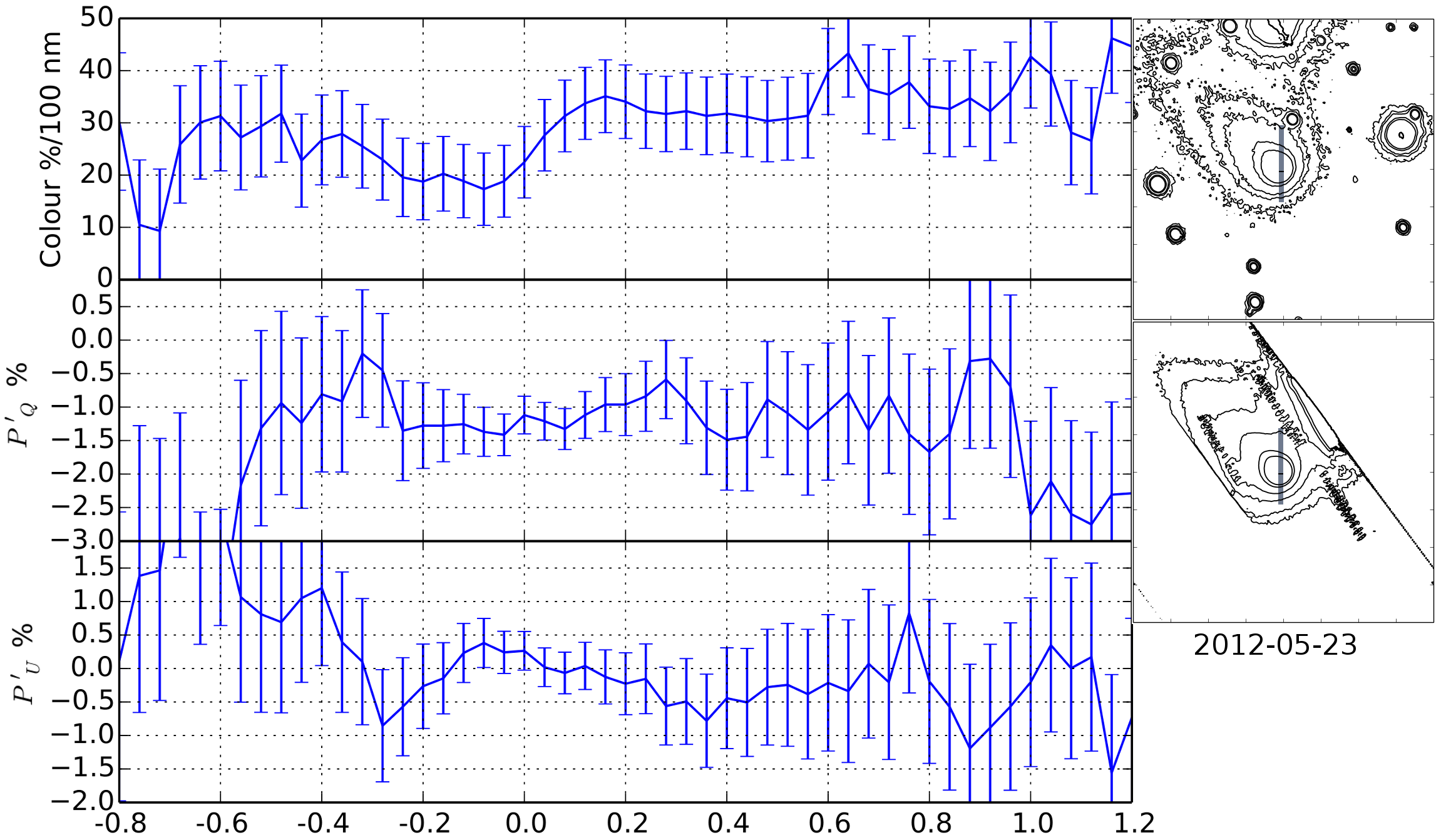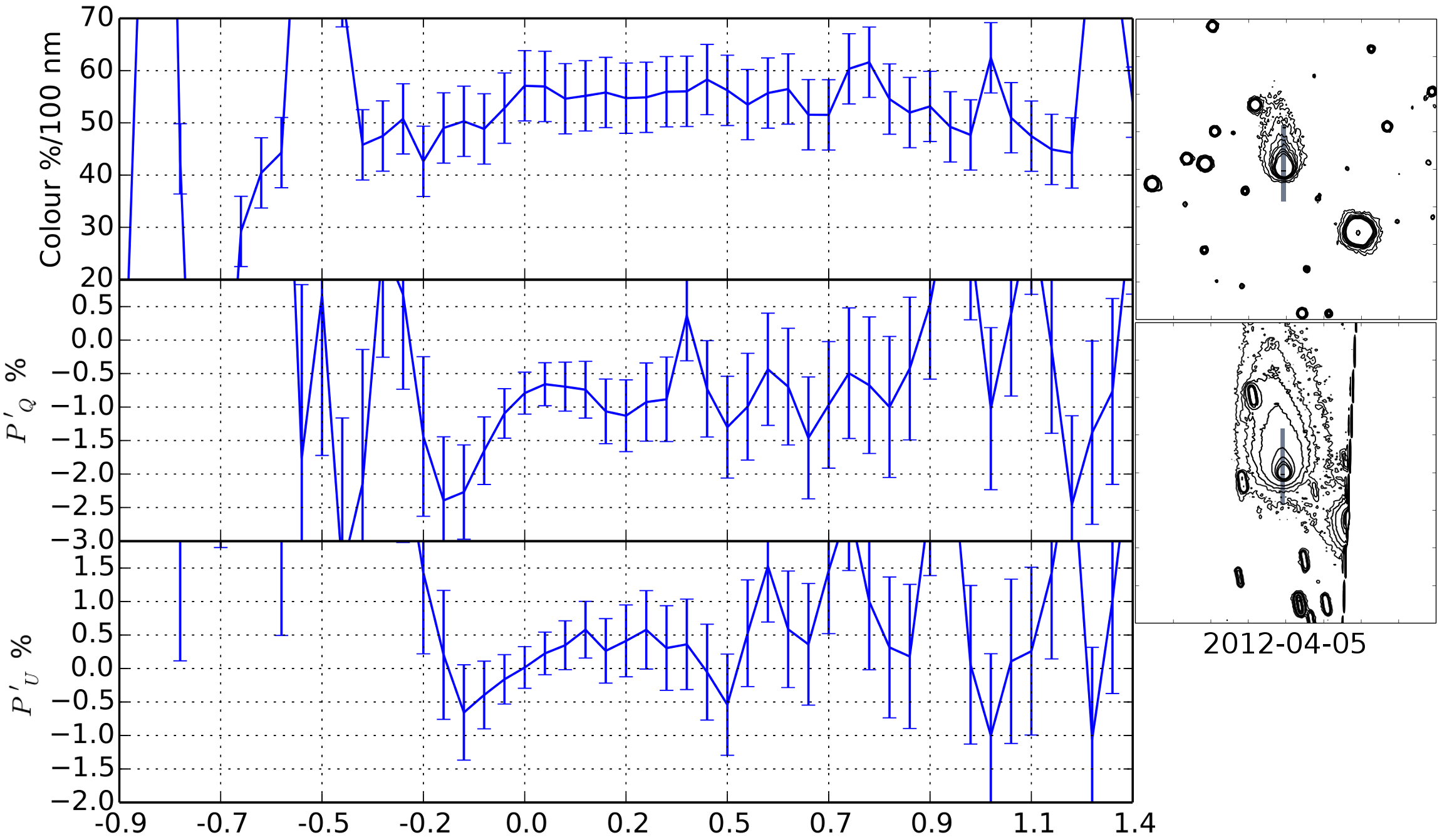 along the solar anti-solar direction. Positive distance is in the anti-solar direction, and negative distance is in the solar direction. Zero is at the photometric centre of the comet. The upper contour plot shows the intensity of the comet in the photometric images and the lower contour plot shows the photometric intensity of the comet in the polarimetric images; the levels are arbitrary. The small grey shaded area in each contour plot shows the area scanned.