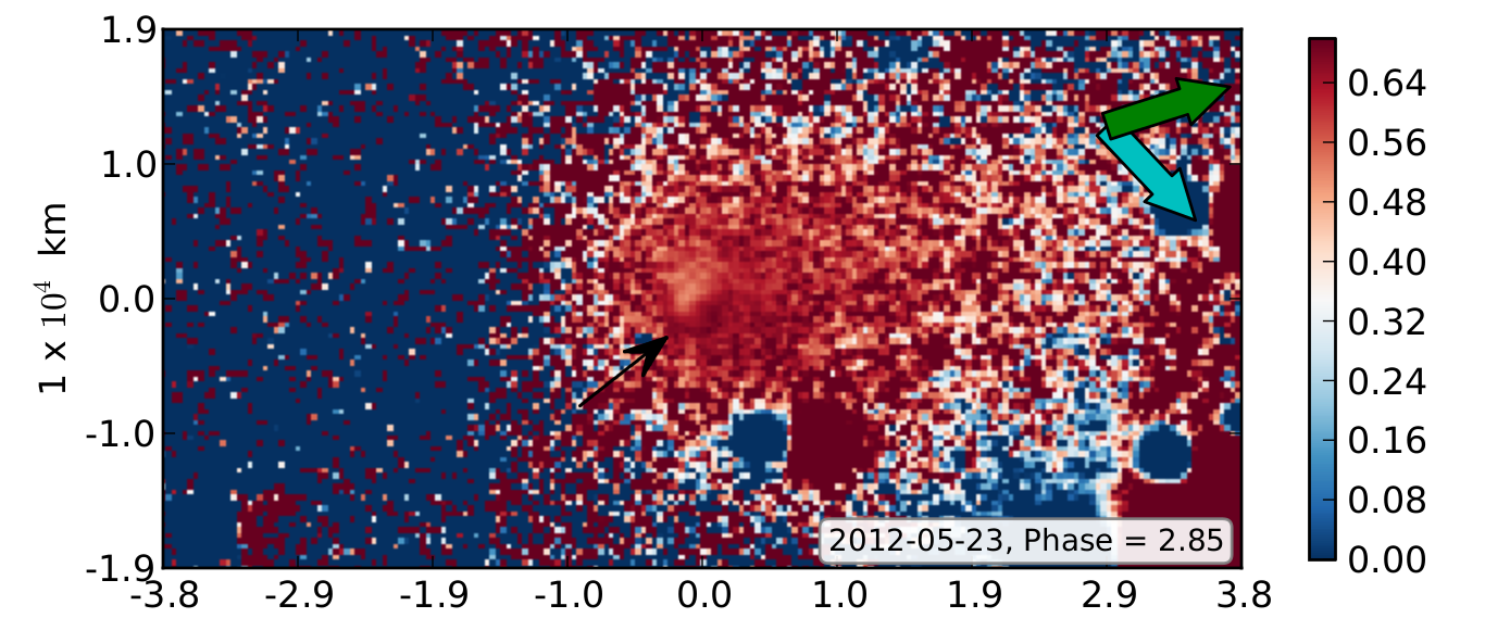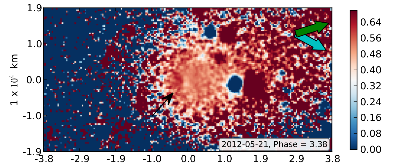 V−R colour map of comet 152P. The green arrow points in the direction of the negative target velocity as seen in the observer’s plane of sky. The cyan arrow is the direction of the anti-solar direction. North is up and east is to the left.