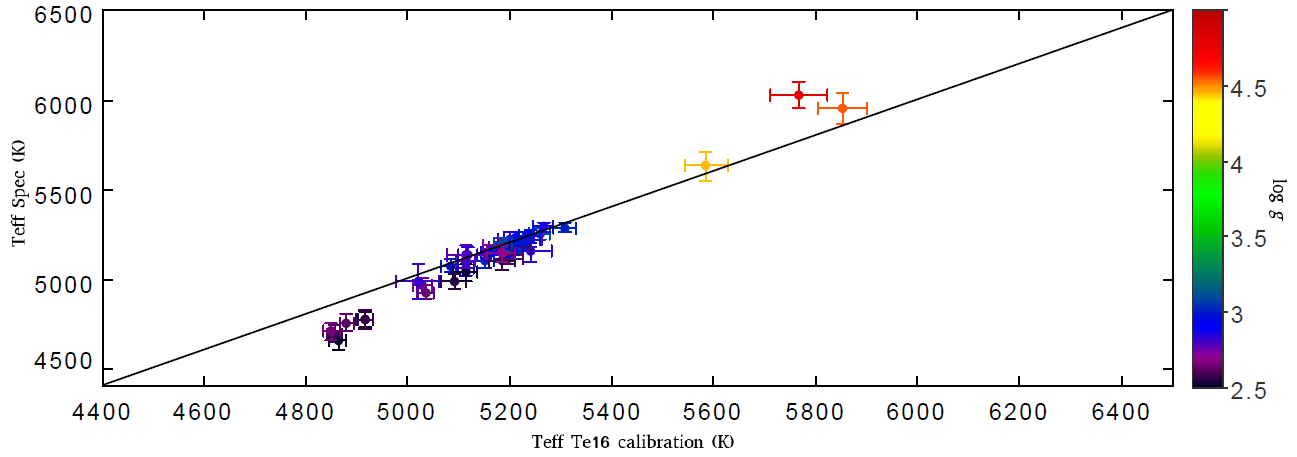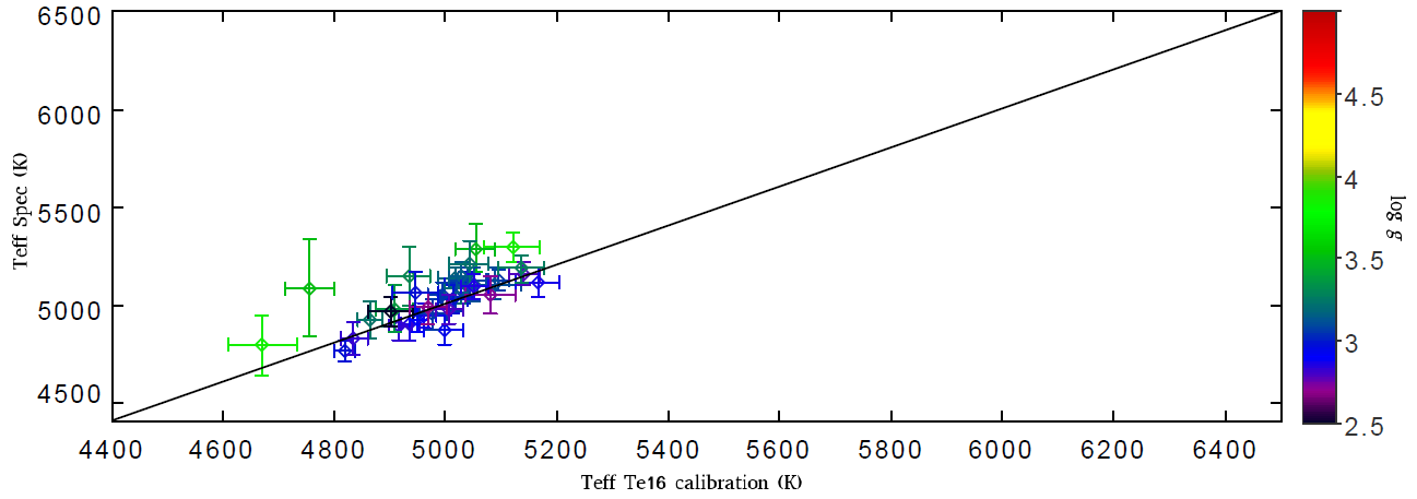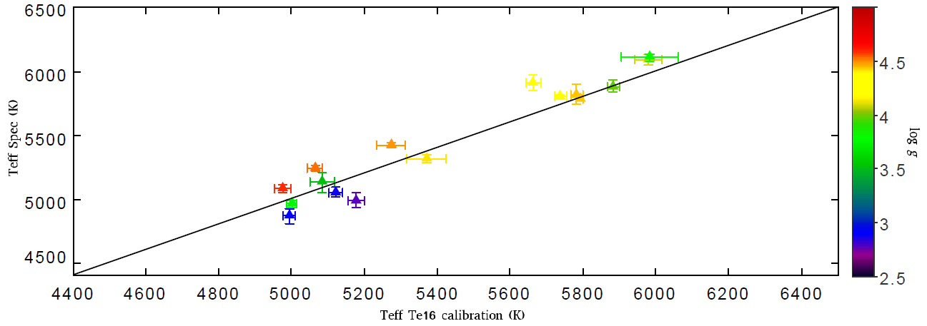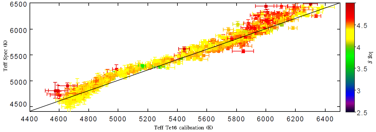 Comparison between the Teff computed with TMCalc and the spectroscopic values with the Te16 calibration for the Gaia, Sa09, GES, and So11 sample from top to bottom. The colour-code represents the log g values and the black line represents the identity line. Only stars within the limits of applicability are plotted.