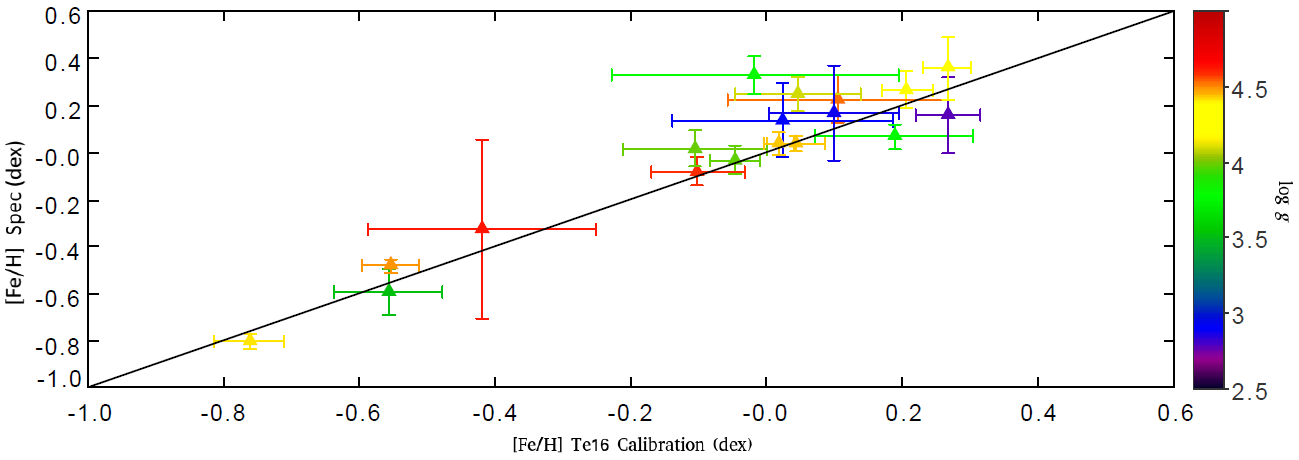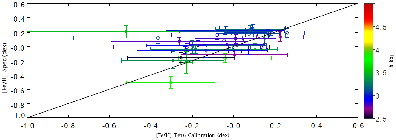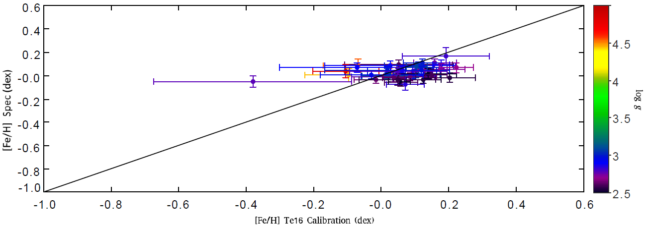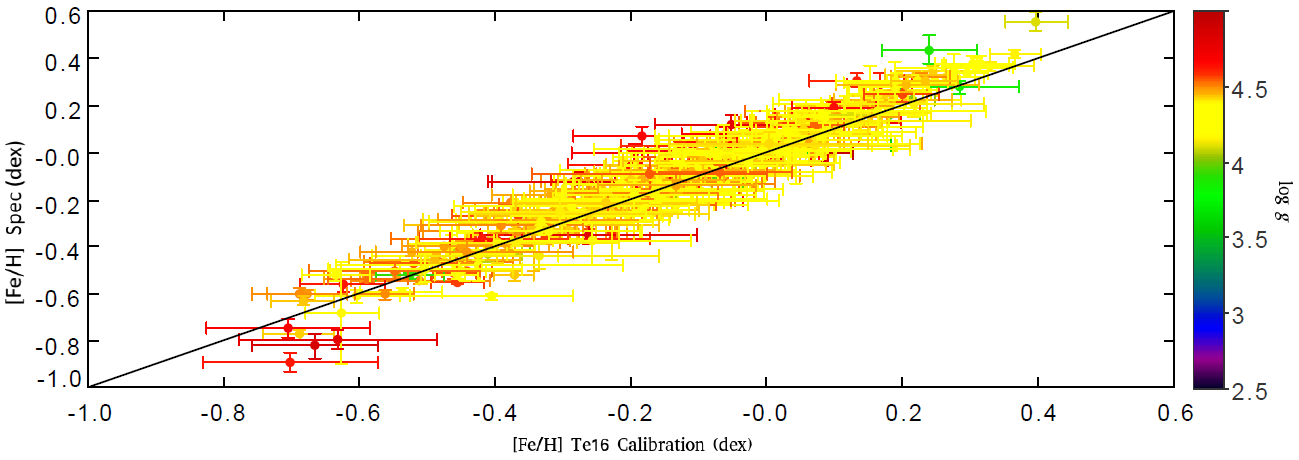 Comparison between the [Fe/H] computed with TMCalc and the spectroscopic values with the Te16 calibration for Gaia, Sa09, GES, and So11 sample. The colour-code represents the log g values and the black line represents the identity line. Only stars within the limits of applicability are plotted.