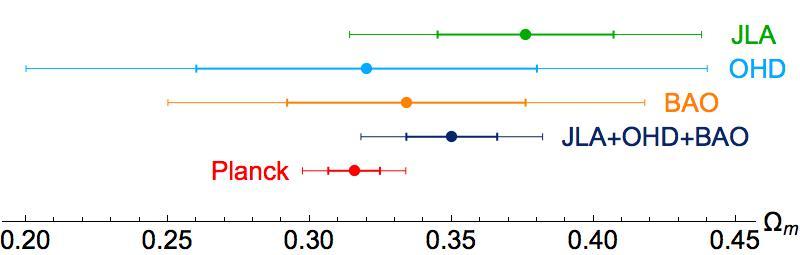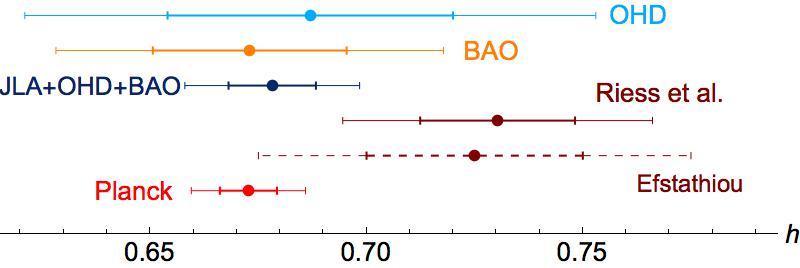 Results at the 1σ and 2σ c.l. for the parameters of the ΛCDM model when fitted to JLA (green), OHD (azure), BAO (orange), and the three datasets combined (dark blue). Constraints from the direct measurement by Riess et al. (2016; dark red), the reanalysis by Efstathiou (2014; dashed dark red), and the Planck Collaboration XIII (2016; red) are also shown.