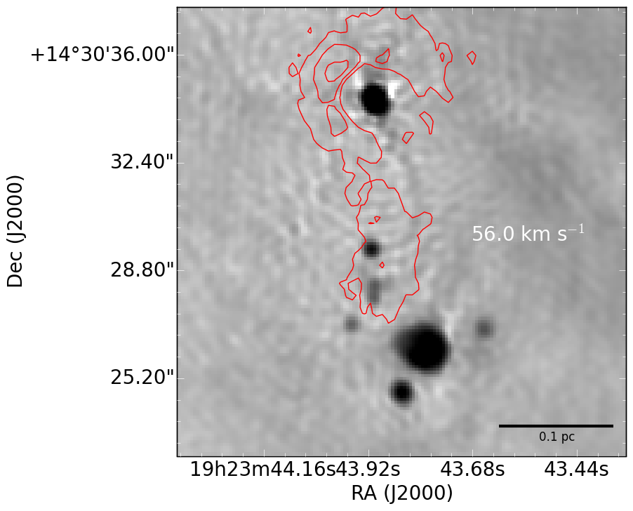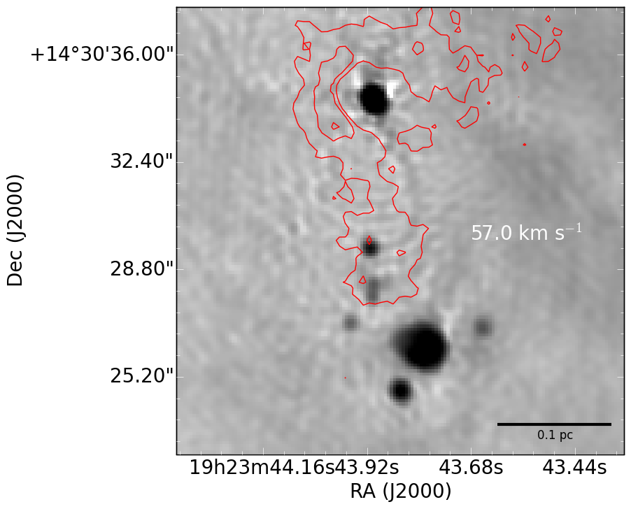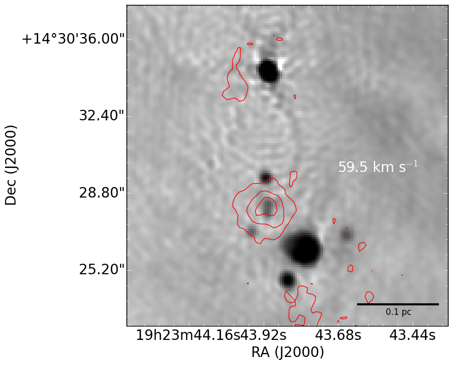 Contours of the H2CO21,1−21,2 naturally weighted emission in the W51 Main region at 3 velocities superposed on the Ku-band 14.5 GHz continuum map. a) shows the peak velocity of the e2 core, where the center of the core is missed because it is in absorption against the bright continuum peak; b) shows the overlap velocity; and c) shows the e8 core