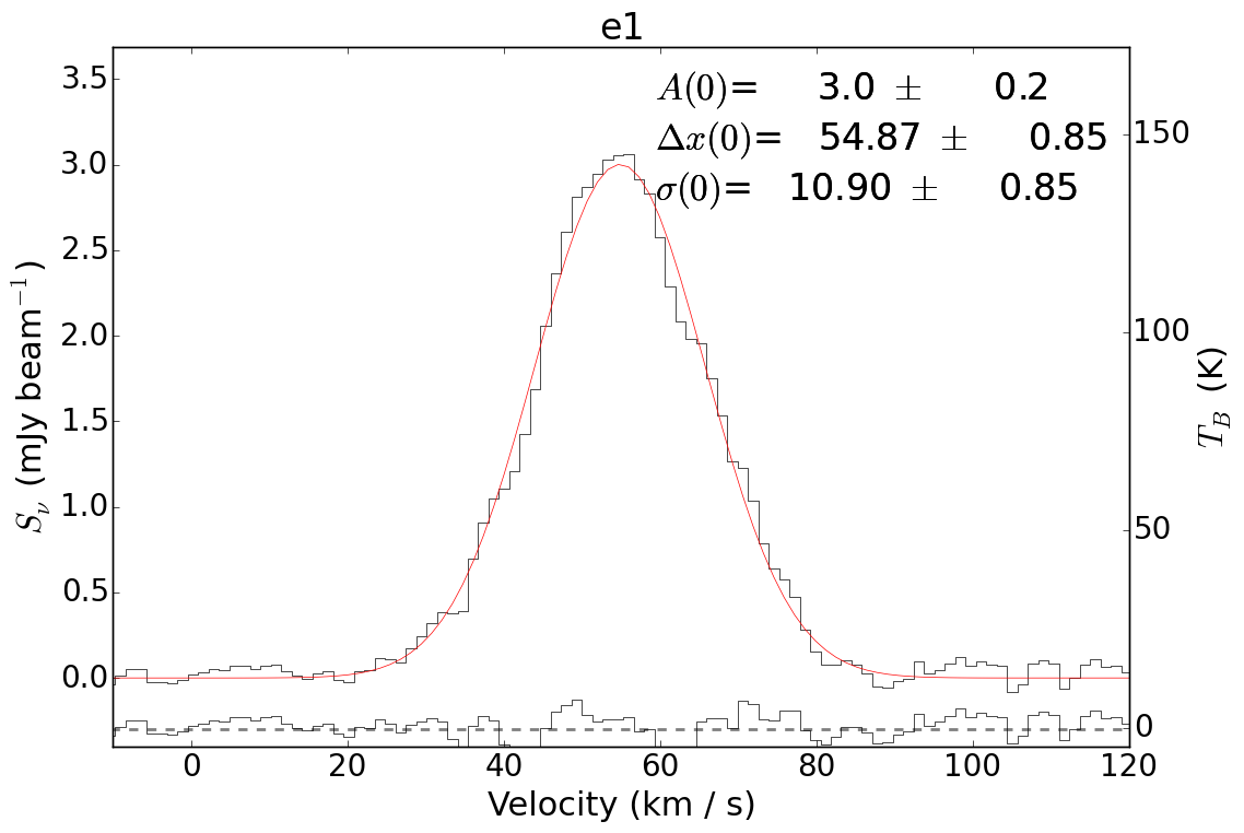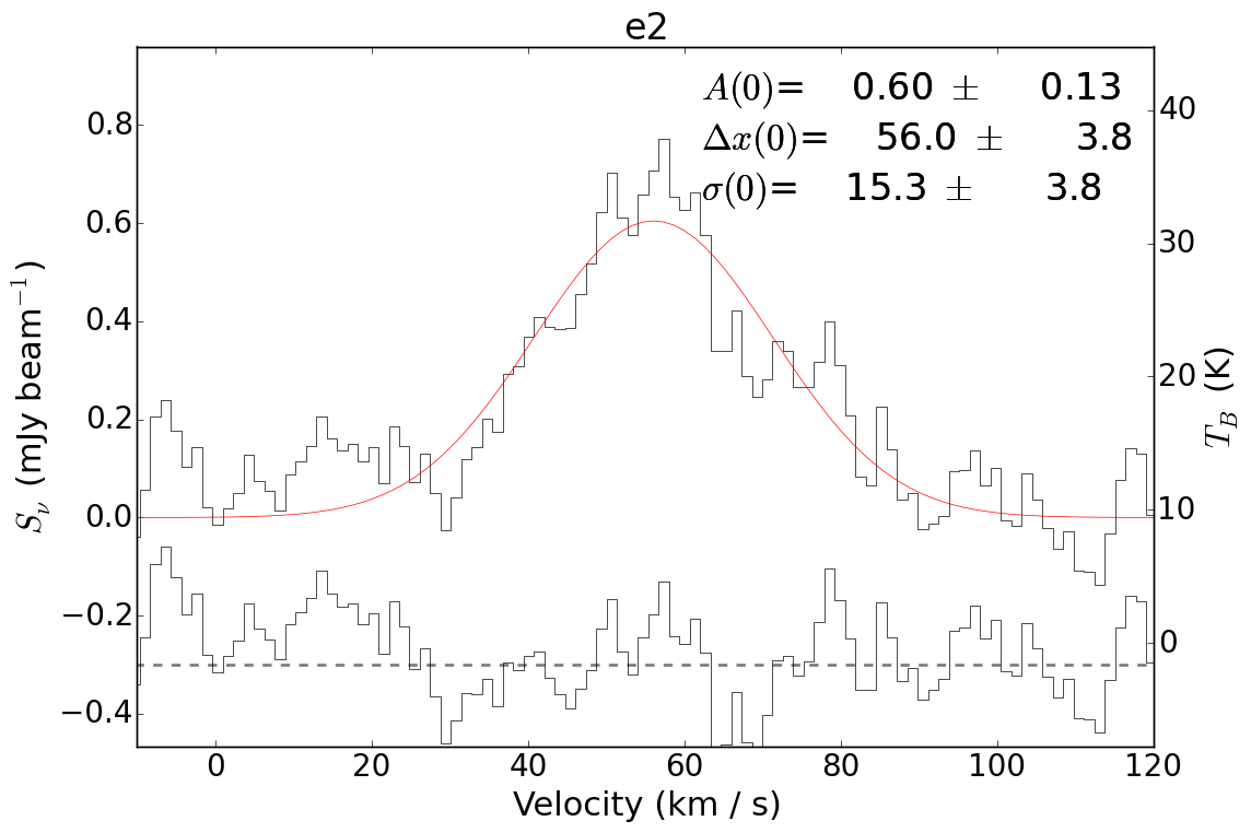 H77α spectra of W51e1 and W51e2. These velocities are used in conjunction with the H2CO emission fits to determine the velocity dispersion in Sect. 4.5. The red curve shows the fit. The lower spectrum shows the fit residual, with the dashed line indicating the zero level.