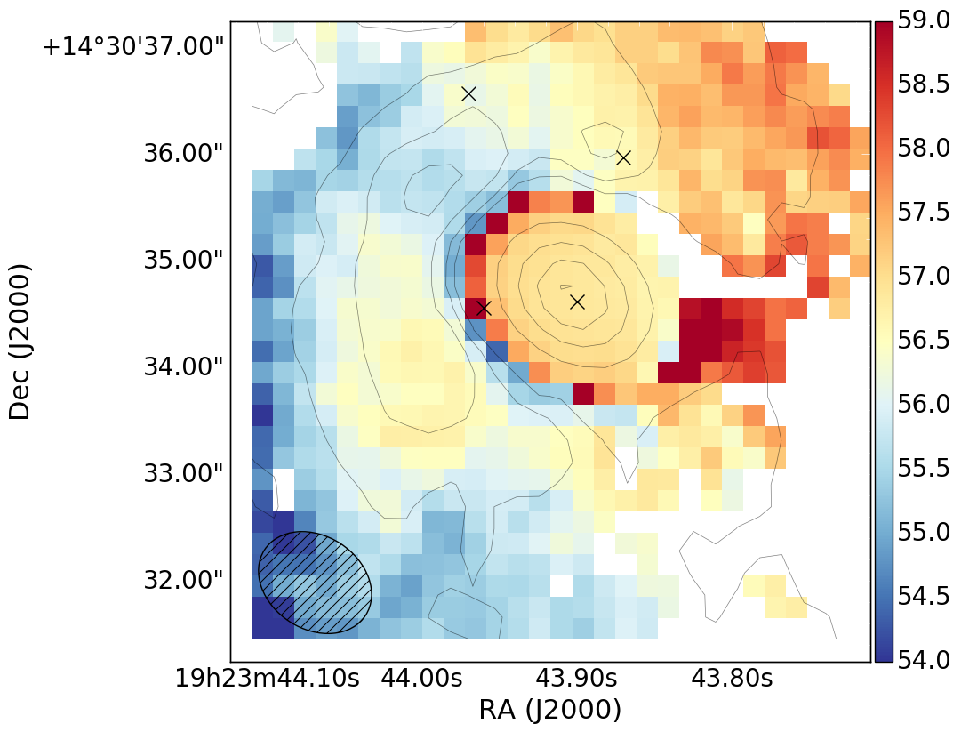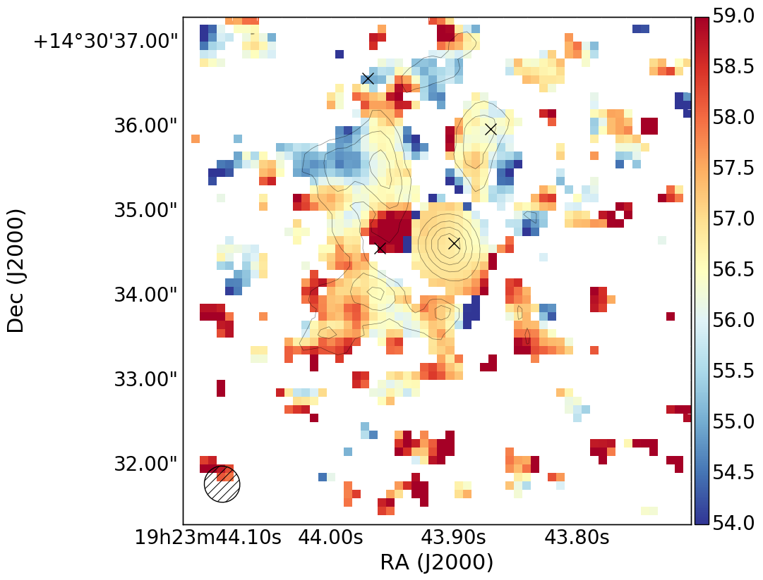 Velocity (moment 1) maps of o - H2CO21,1−21,2 in the W51e2 region using a) the naturally weighted map and b) the Briggs w = 0.5 weighted map. The X’s mark Shi et al. (2010b) cores. The contours show the moment 0 maps integrated from 50 to 63 km s-1 at [–0.4, –0.3, –0.2, –0.1, 0.010, 0.020, 0.030, 0.040] Jy km s-1 (natural) and [–0.28, –0.21, –0.14, –0.07, 0.007, 0.0105, 0.014] Jy km s-1 (Briggs).