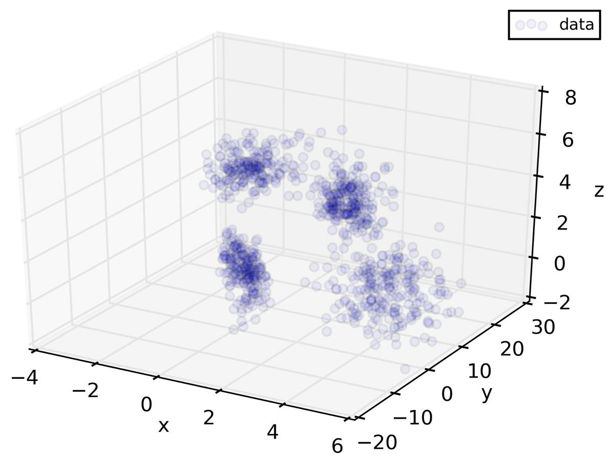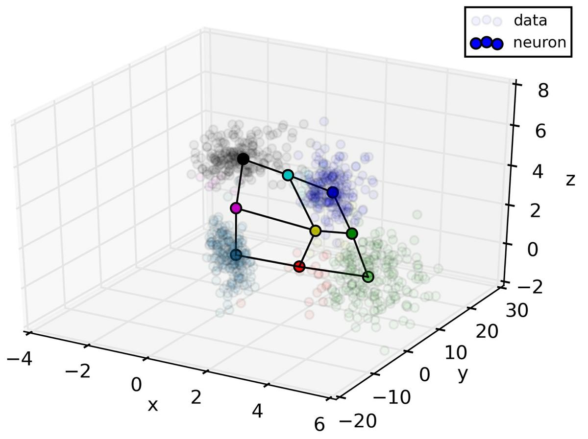 Distribution of the mock data (left panel), generated as described in Sect. 2.3. The x and z coordinates for each data point are drawn from four different Gaussian distributions with different means and covariances. The covariance is assumed to be diagonal. The y coordinates are generated to be correlated with the x coordinates with a correlation function consistent with Eq. (2)(see Table 1 for the correlation coefficients). The right panel shows the data space including the 3 × 3 square lattice neuron pattern after a successful training of the SOM. Neighboring neurons are interlinked in the picture. In addition, each sub-sample of data corresponding to one neuron, is drawn in the color of the specific neuron.