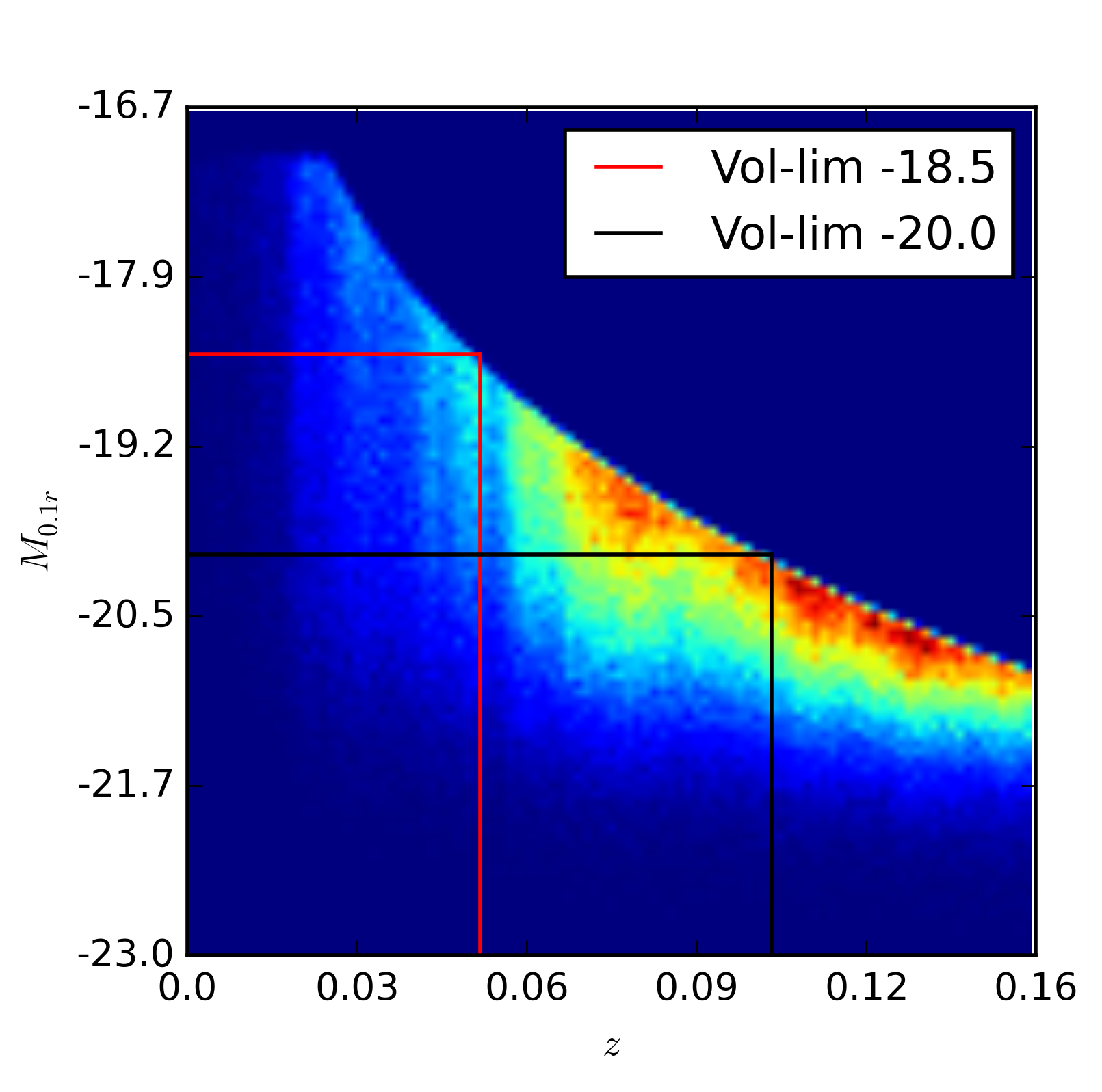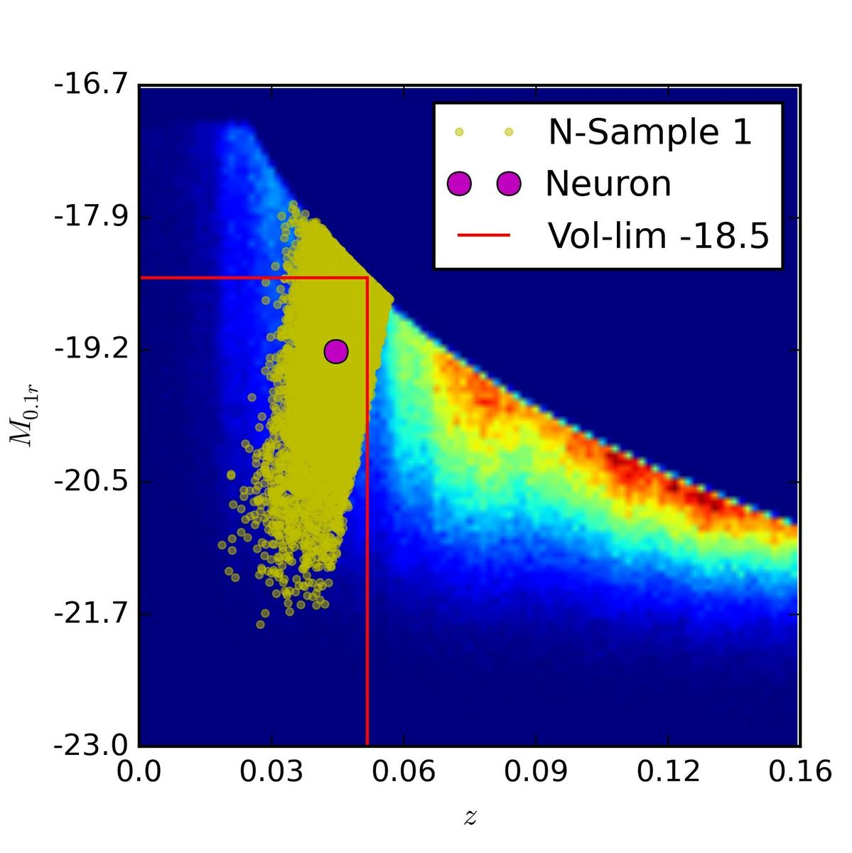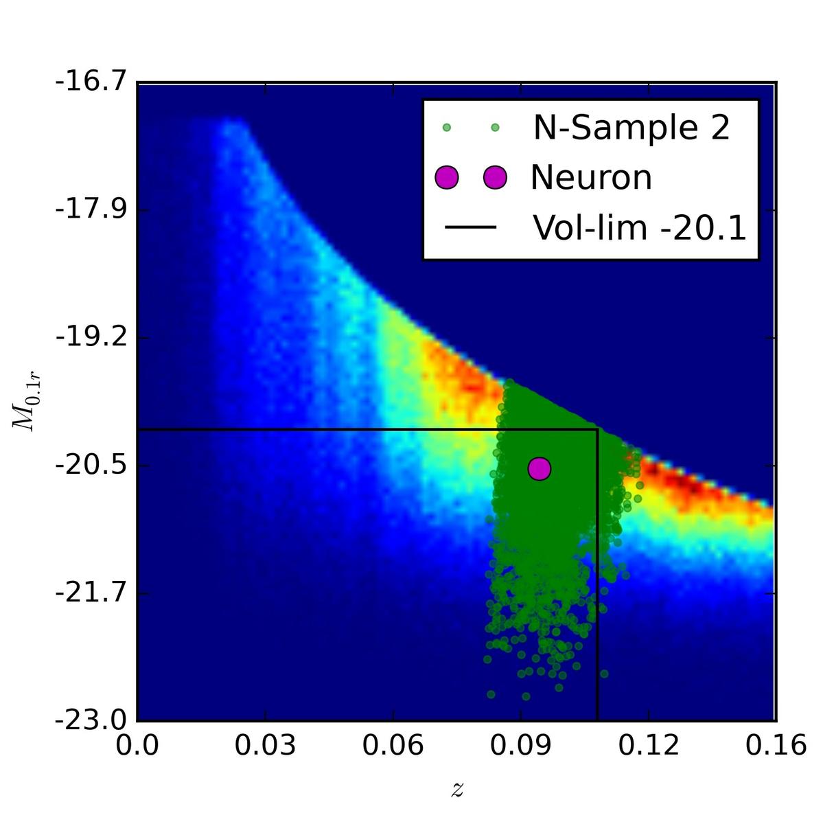 Distribution of the SDSS data projected to the M0.1r-z-plane. The top-left panel shows the volume limitation for different absolute magnitude thresholds (− 18.5, − 20.0). The bottom-left panel shows the distribution of the neurons after a successful application of the SOM to the SDSS data. The top-mid and bottom-mid panels show two different neuron-samples (N-Samples) corresponding to the depicted neurons from the trained SOM. In addition, the volume limitation used for the correlation comparison are depicted in both panels. The selected neurons hold sub-samples of data with a similar projected distribution compared to the volume-limited samples in order to compare the selection methods. The top- and bottom-right panels show reconstructed correlation functions for the volume limited sample with magnitude limits at − 18.5 (top) and − 20.1 (bottom) and for the corresponding neuron-samples. The range of each sub-sample in log (1 + δ) is indicated by the length of each reconstructed polynomial.