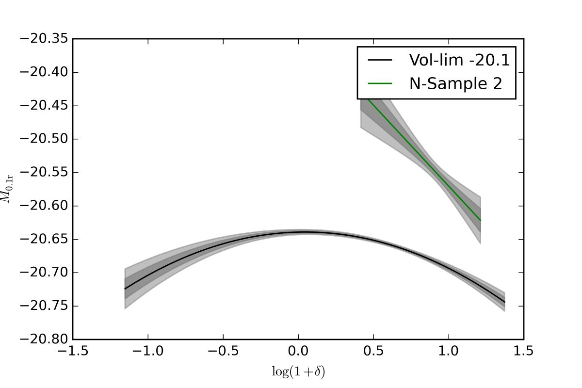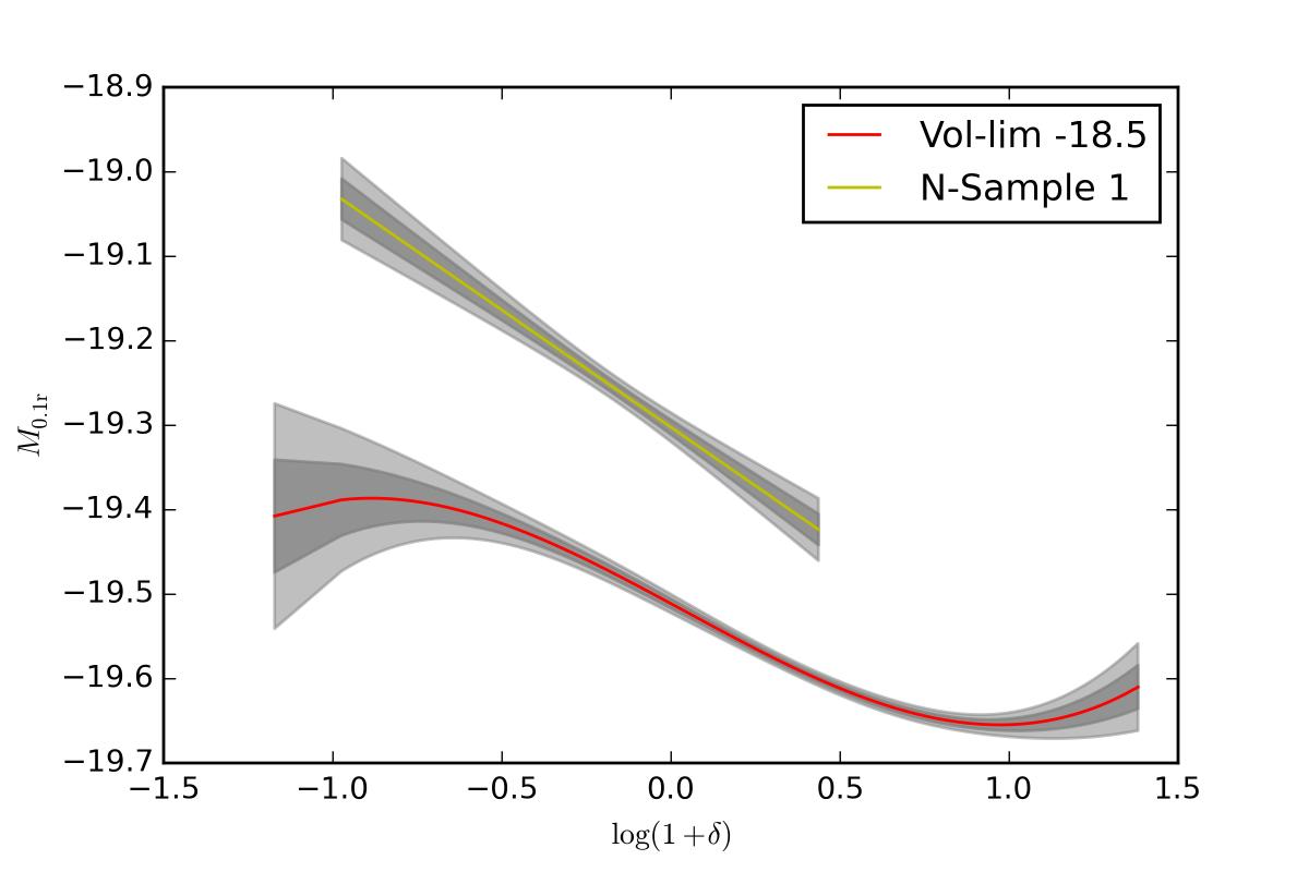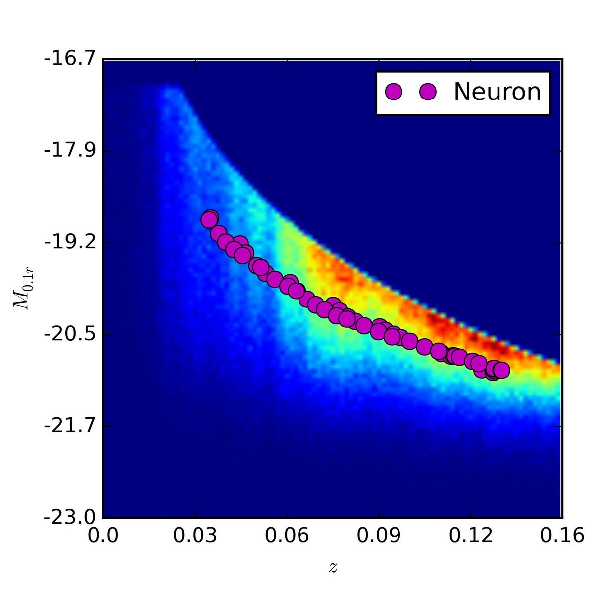 Distribution of the SDSS data projected to the M0.1r-z-plane. The top-left panel shows the volume limitation for different absolute magnitude thresholds (− 18.5, − 20.0). The bottom-left panel shows the distribution of the neurons after a successful application of the SOM to the SDSS data. The top-mid and bottom-mid panels show two different neuron-samples (N-Samples) corresponding to the depicted neurons from the trained SOM. In addition, the volume limitation used for the correlation comparison are depicted in both panels. The selected neurons hold sub-samples of data with a similar projected distribution compared to the volume-limited samples in order to compare the selection methods. The top- and bottom-right panels show reconstructed correlation functions for the volume limited sample with magnitude limits at − 18.5 (top) and − 20.1 (bottom) and for the corresponding neuron-samples. The range of each sub-sample in log (1 + δ) is indicated by the length of each reconstructed polynomial.